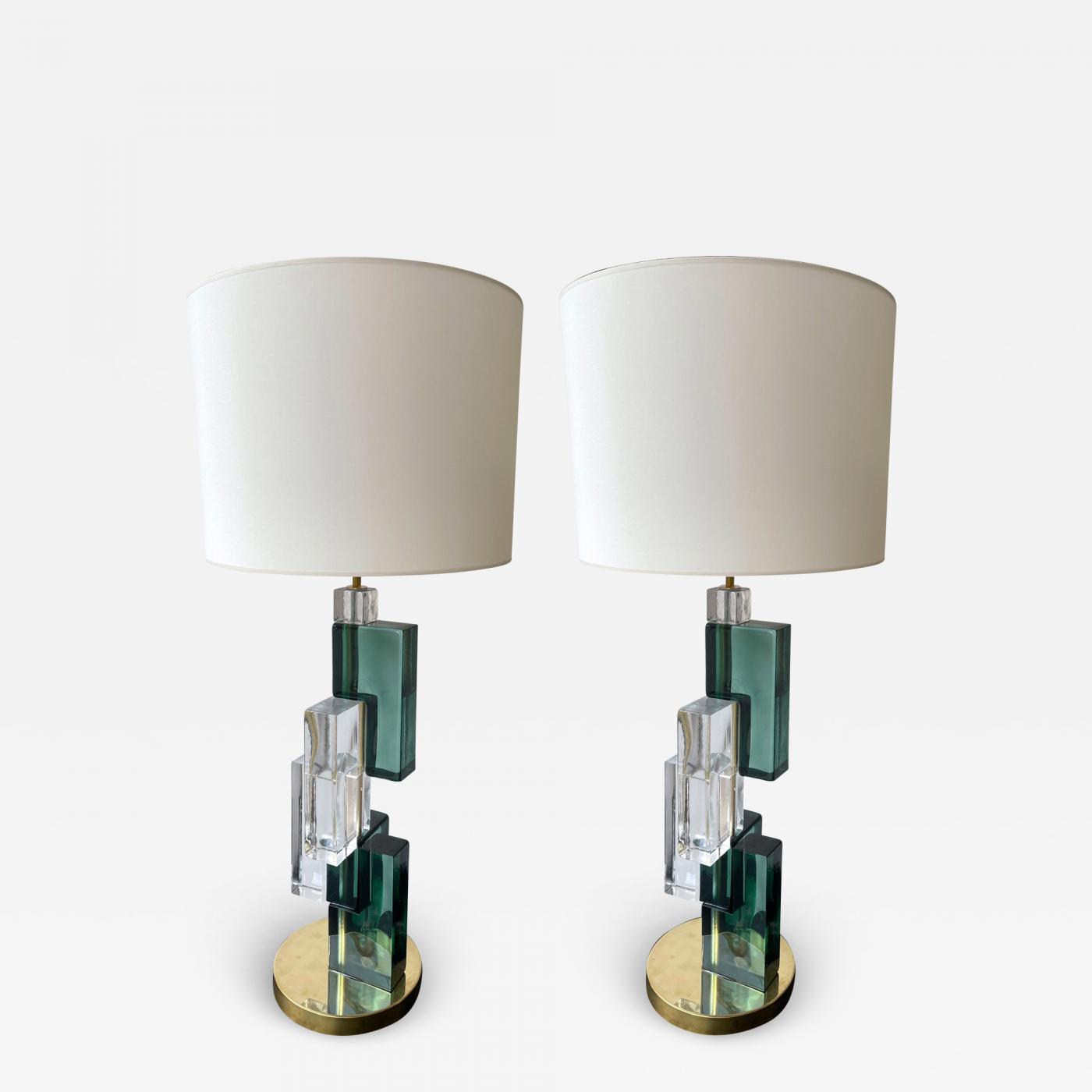 Contemporary Pair of Lamps Green Cubic Murano Glass and Brass, Italy