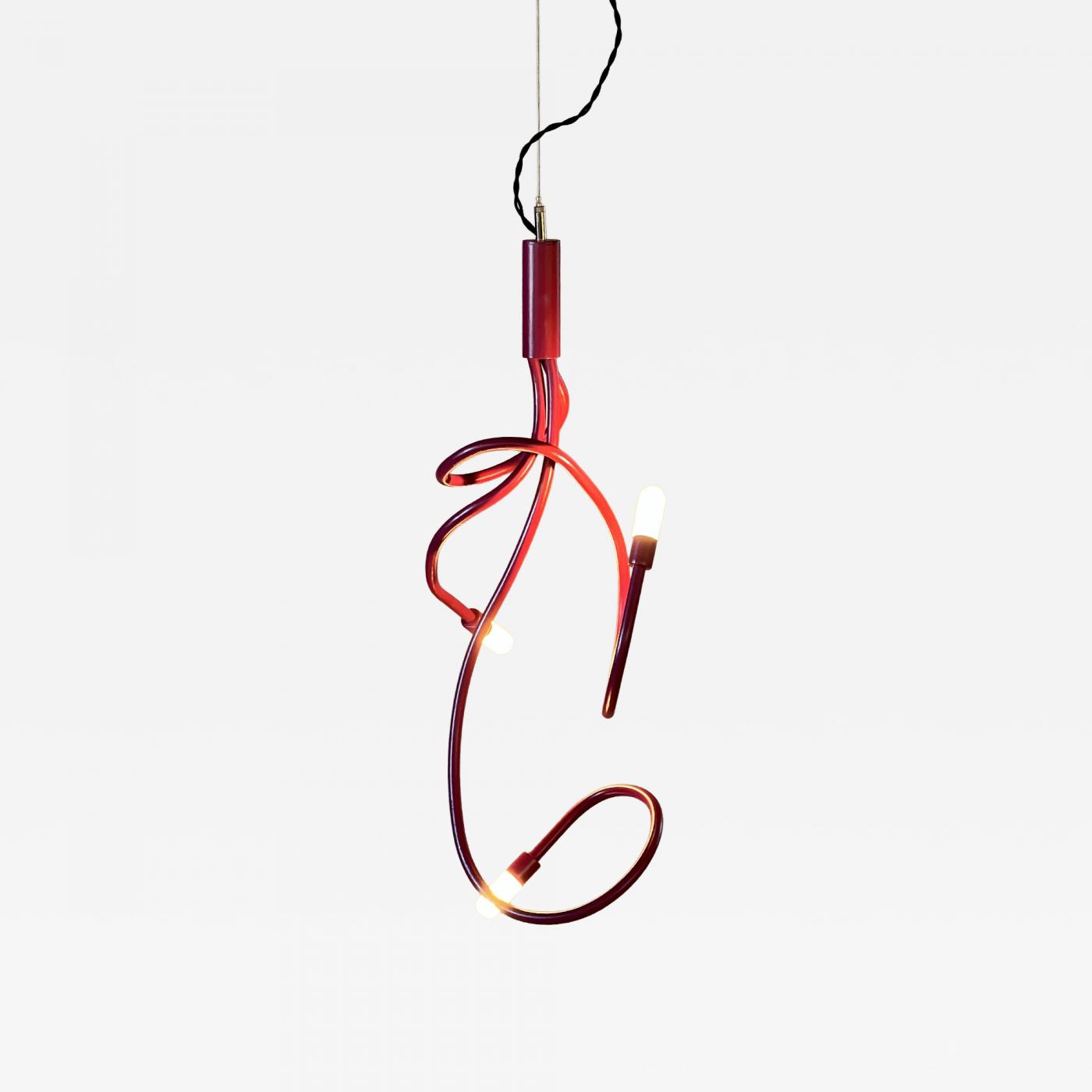 Made to order whimsical pendant lamps, the Sketchy Jr is designed to represent a 3D pencil scribble. No two are ever alike, though we are happy to offer pairs that are similar to each other if desired. We make these pendants by running random curls of brushed aluminum 1/2" diameter tubing through our ring roller and then fitting three of these scribbles together to form a beautifully balanced and original pendant lamp. 24" tall seems to be the ideal proportion, though we are happy to build to suite from around 18" to 36" H. Available in a full spectrum of colors -- just let us know what suits your fancy. These pendant lamps work great individually, in pairs or even in larger groupings for stairwells or in place of a chandelier over a dining table. Use your imagination, we did!