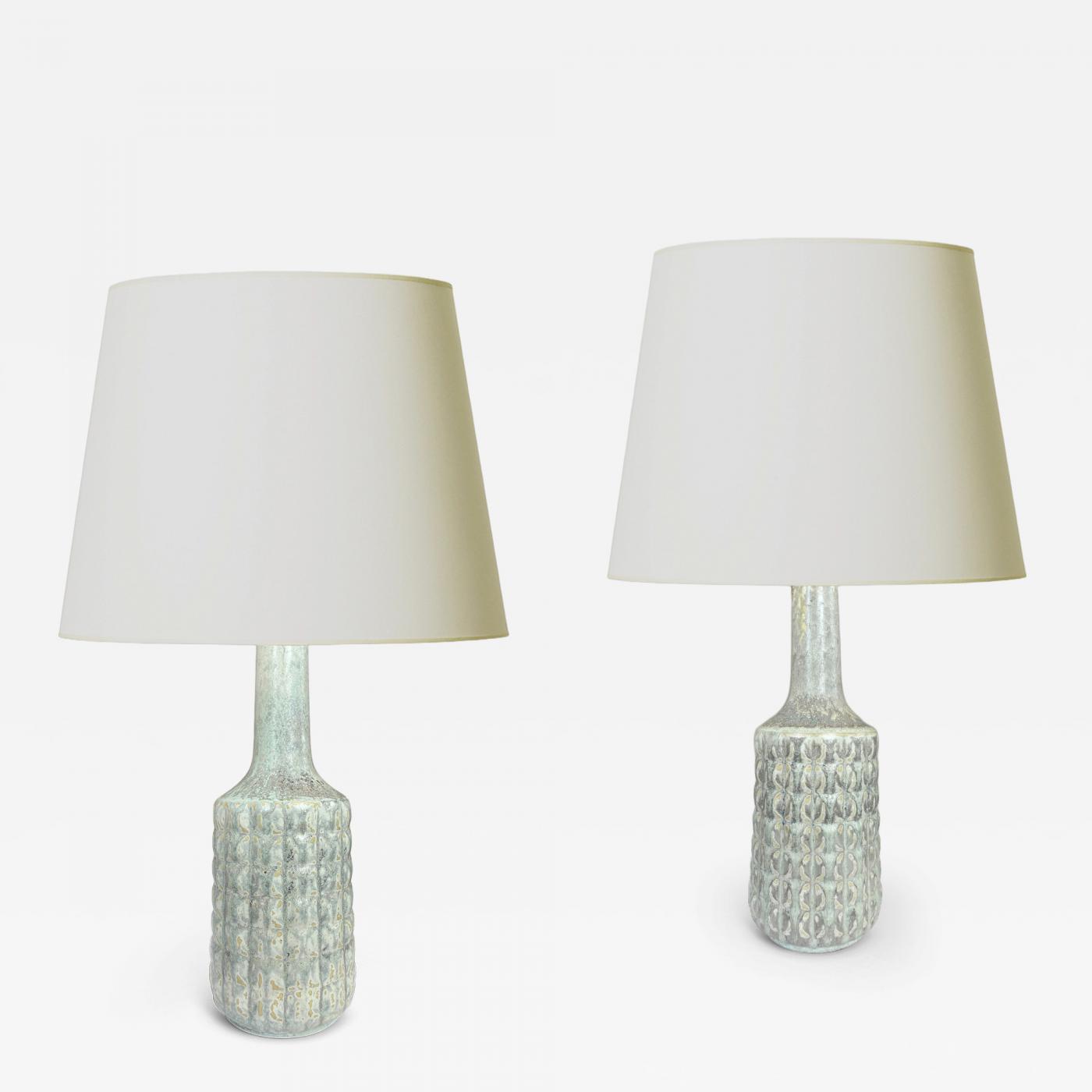Nordic Modern matched pair of table lamps by Desireé Stentøj, having bottle-like forms encircled in relief grids; glazed in pale gray with hints of ice blue and tan; stoneware; Denmark, 1960s-1970s; carved below “Desireé Stentøj Denmark”
