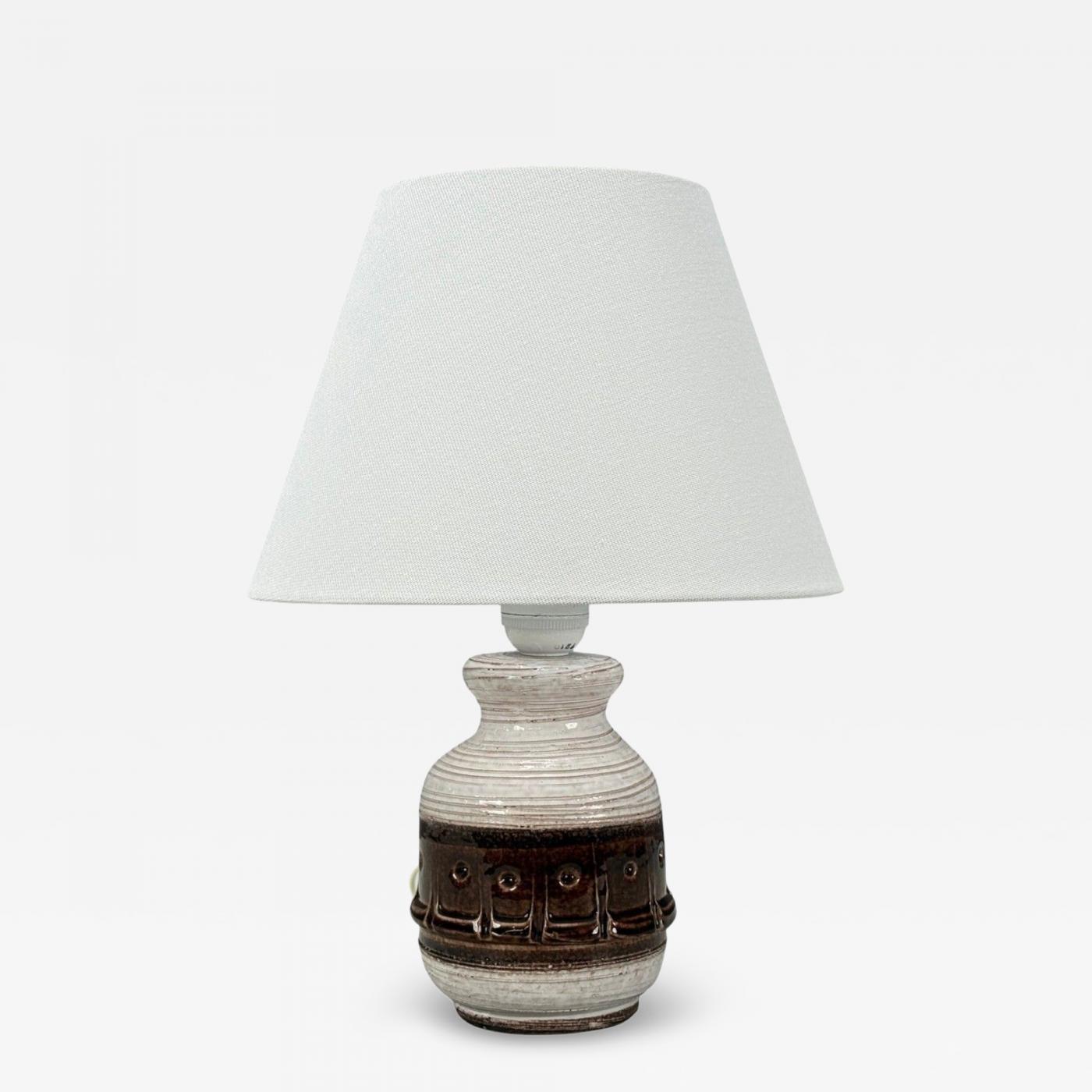A modernist white and brown glazed table lamp produced by an unknown ceramicist in Denmark in the later half of the 20th century. Will be re-wired upon purchase.