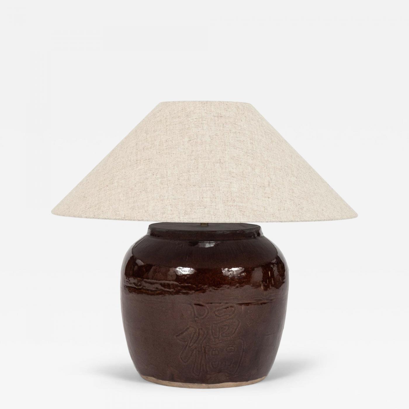 Origin: United States Period: New Materials: Handmade fired and glazed terracotta, cast metal and plastic, and woven linen Condition: Good. Newly wired for use within the USA using UL listed parts. Includes linen coolie shade with uno attachment and line switch. Vintage glazed Asian pot newly wired into table lamp. Creation Date: 2025 Styles / Movements: Modern, Asian Dealer Reference #: 4103 Incollect Reference #: 849323 -