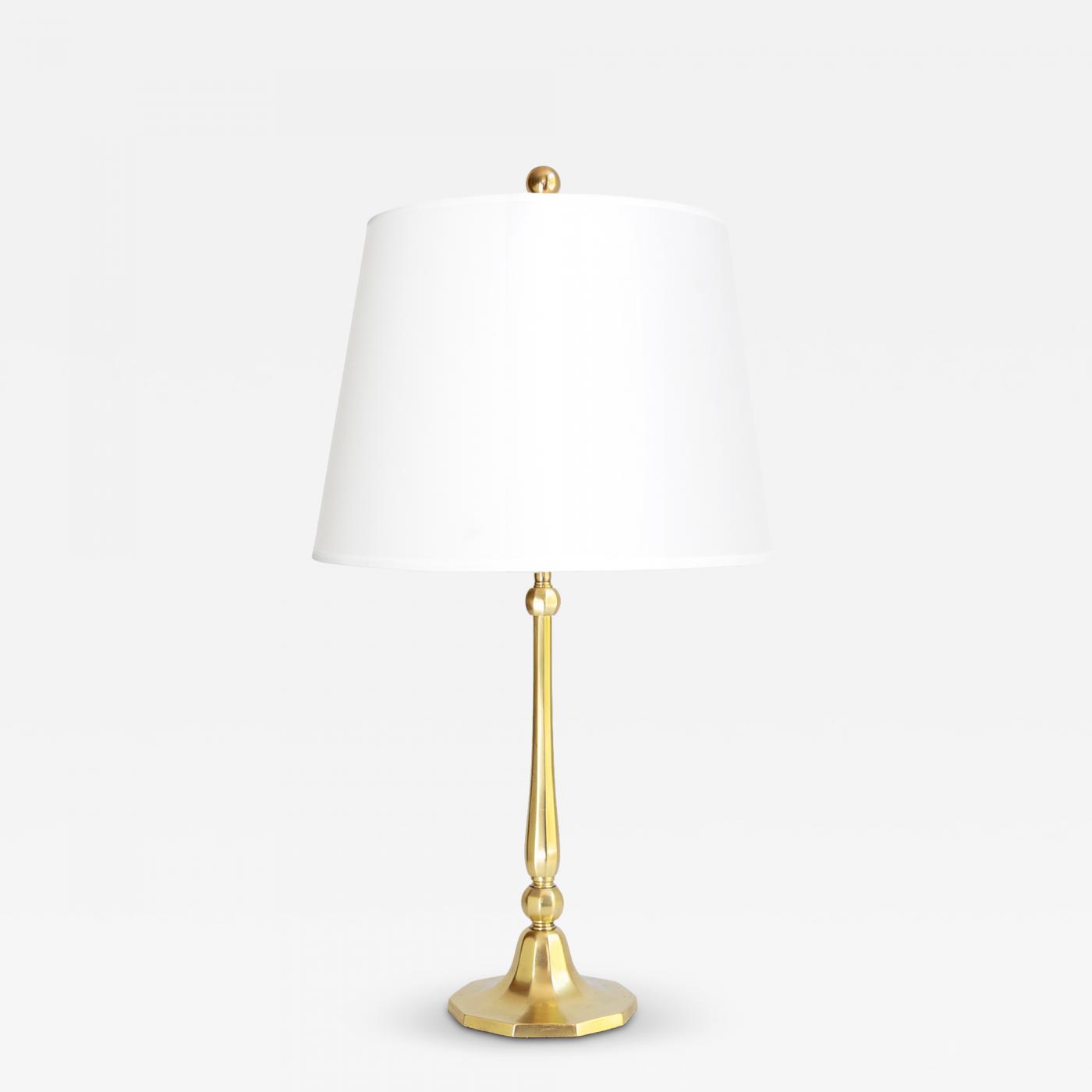 ELEGANT DANISH ART DECO POLISHED BRASS TABLE LAMP WITH DECAGON BASE.