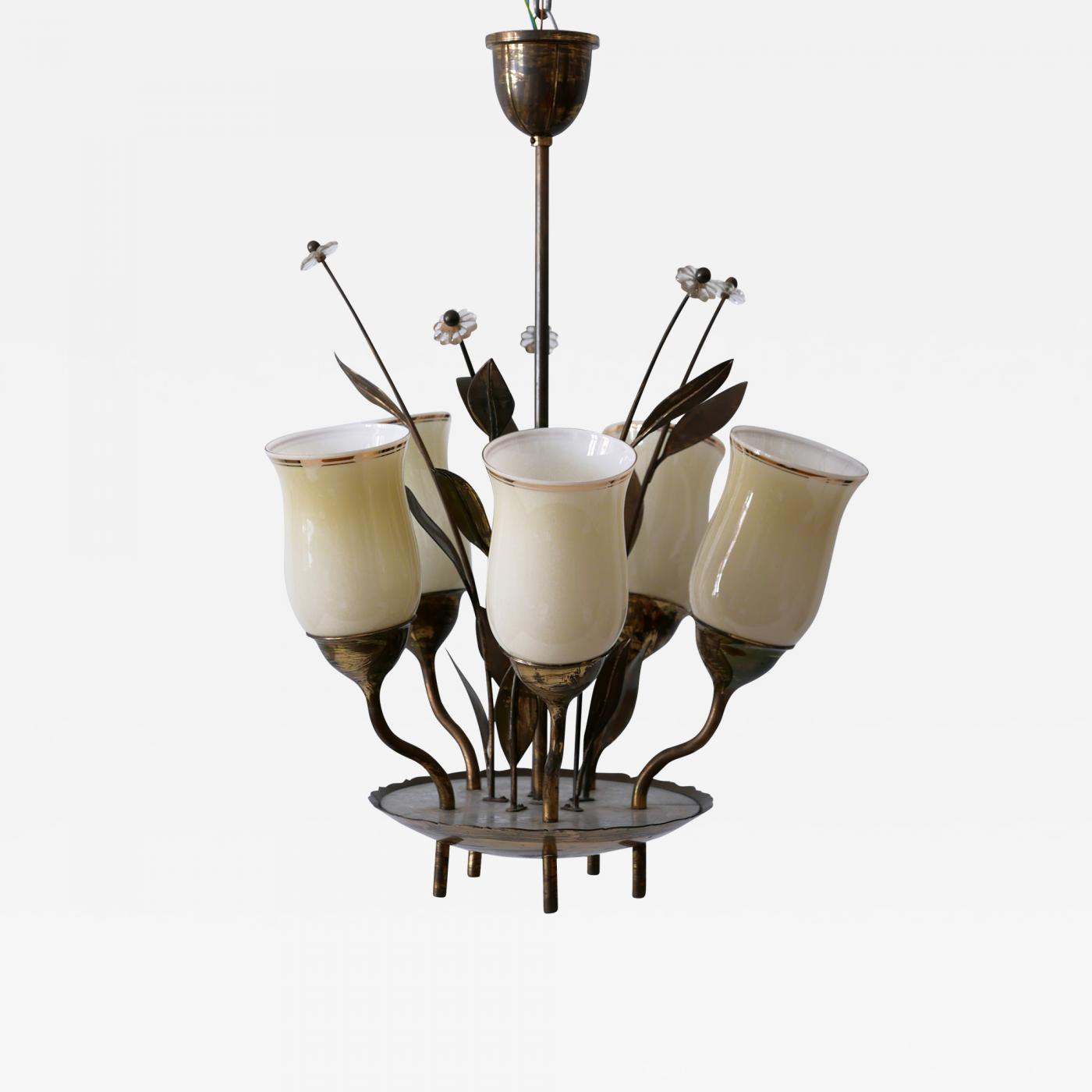 Extremely rare, elegant & highly decorative Mid-Century Modern five-flamed chandelier or ceiling lamp. Designed and manufactured probably in Finland or Sweden, 1950s.