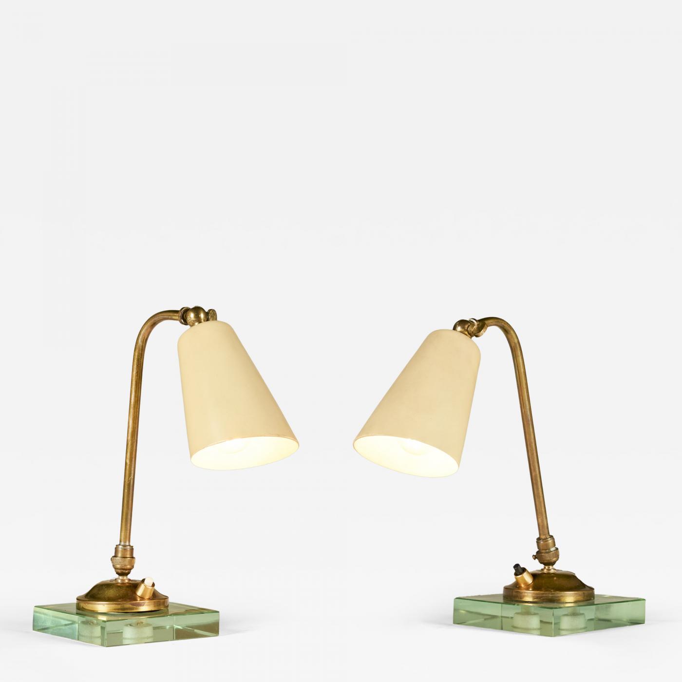 Chic pair of desk / table lamps. Adjustable cream metal shade hangs from adjustable gooseneck curved brass arm with circular tiered detail that hold press button switch. Sits on thick green glass square base. -