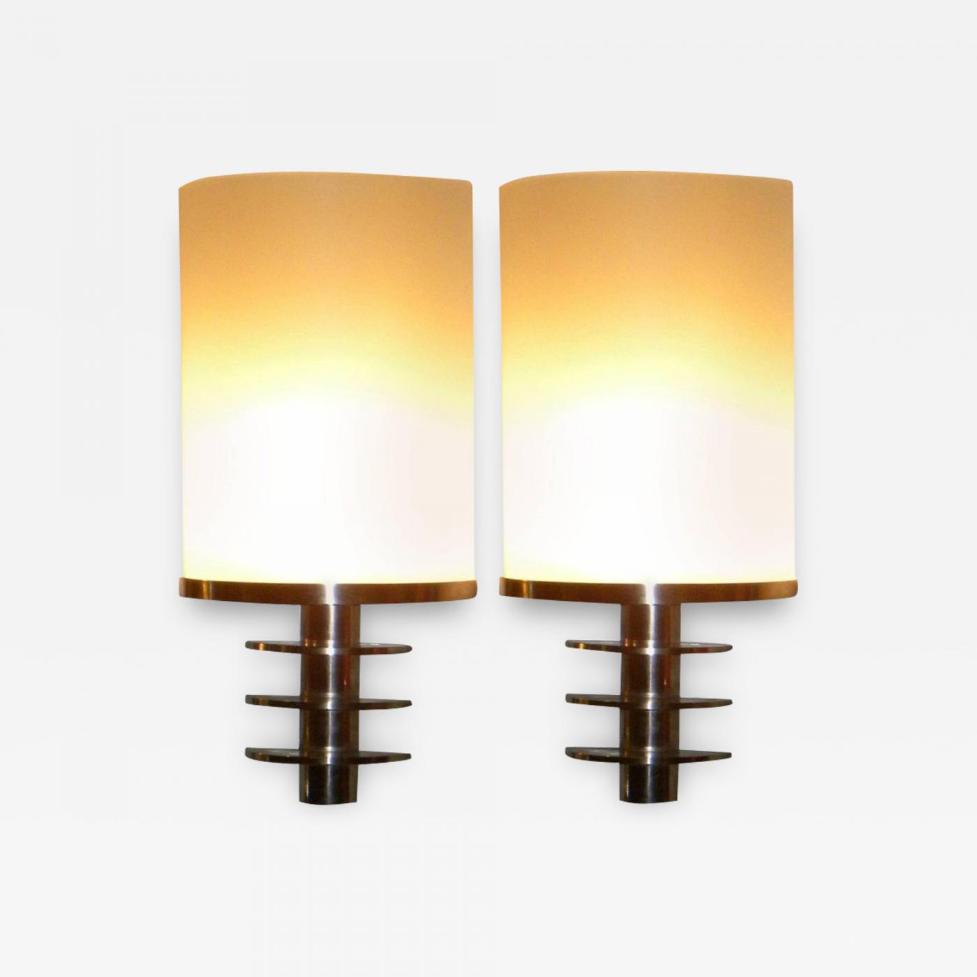 Unique Art Deco French machine age, industrial theater sconces. Large size using satin nickel finish with half round frosted glass. Originally bayonet style sockets, recently converted to candelabra size which allows multiple style of bulbs. Impressive and rare style. Not the typical French moulded glass you see available for sale.