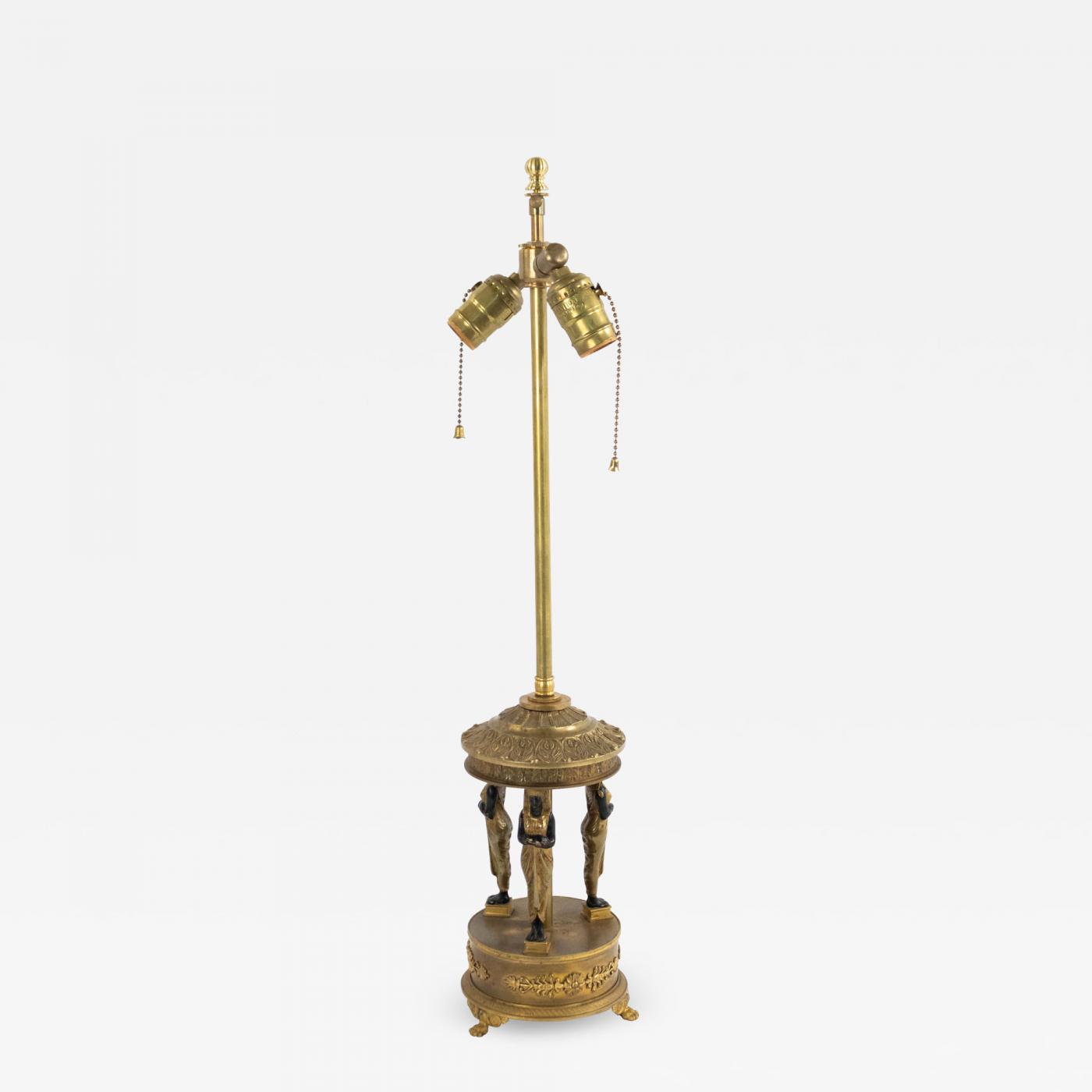 French Empire-style (19th Century) bronze lamp with 3 Egyptian ebonized & gilt figures resting on a round base.