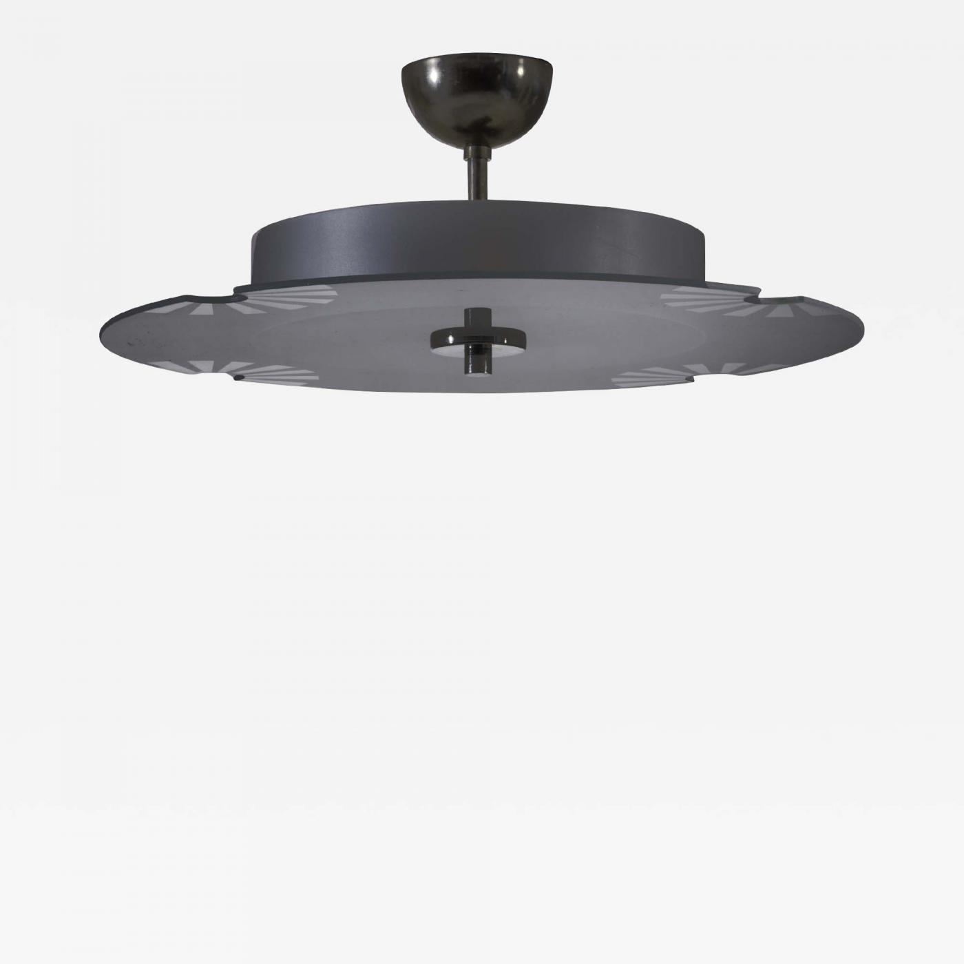 A Scandinavian Modern ceiling lamp with a frosted glass disc diffuser with four openings in it, with a sunburst motif around them. A glass ring is placed on top to distribute the light. The lamp hangs from a nickel-plated brass stem.