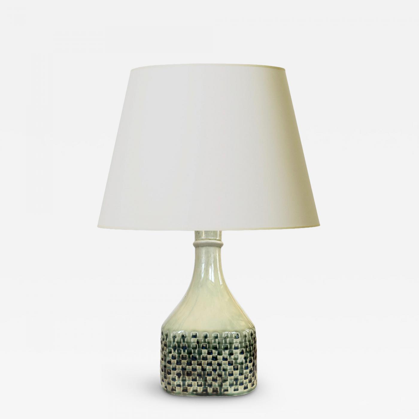 Studio table lamp by Stig Lindberg (1916-1982 ) for Gustavsberg, having a square bottle-like form with checker reliefs and sprouting neck, glazed in ivory with flowing blue-gray; stoneware; Sweden, 1972; carved artist studio mark