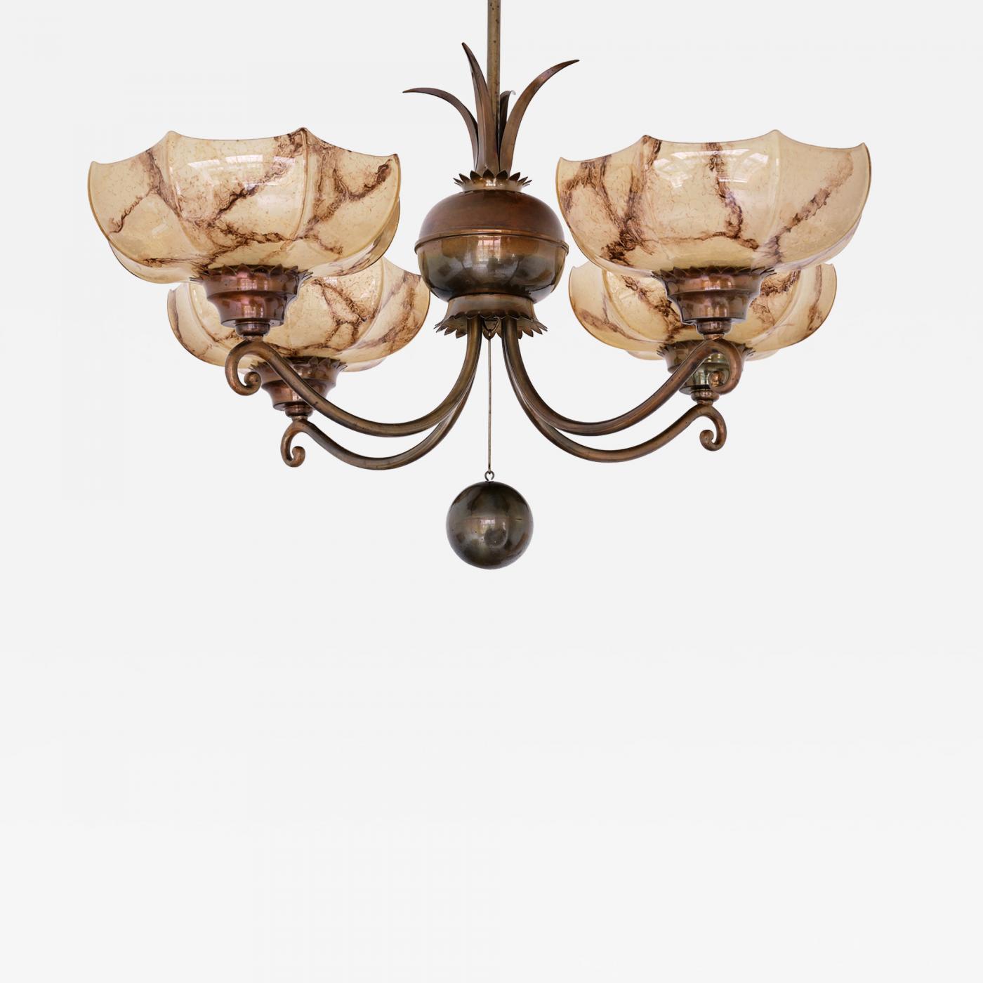 A striking and extremely rare example of Swedish Grace lighting. With the marbled shades and distinct forms, the chandelier is beautiful both with the light turned on and off. The intricate details, the materials used and the high level of craftsmanship perfectly illustrate the originality and quality of both Harald Notini and the manufacturer Böhlmarks.