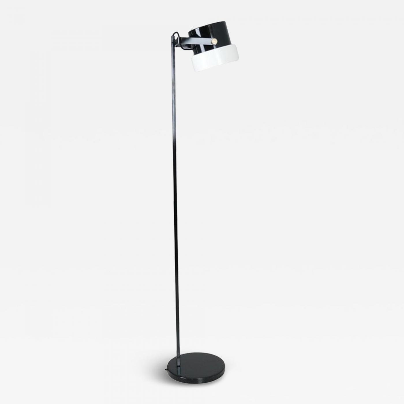 A slim black and white floor lamp designed by Heikki Turunen and manufactured by Orno Oy in the 1970s in Finland. The lamp has an adjustable shade allowing it to move up, down and sideways. It is overall in good condition with wear and tear consistent with age and use.