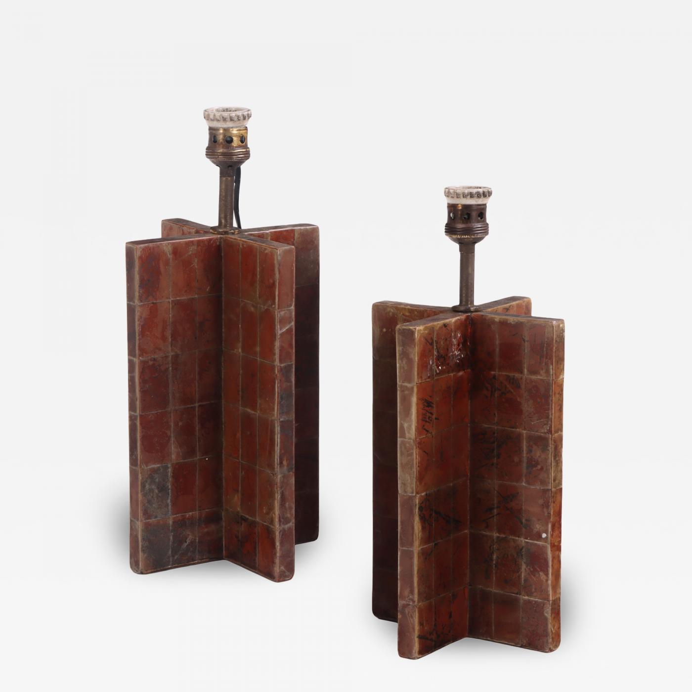 A pair of striking lamp bases of cruciform form, entirely clad in a meticulously arranged patchwork of natural mica squares, creating a richly textured, softly luminous surfaces. The geometric composition highlights the material’s organic variations, lending warmth and subtle iridescence. Each fitted with a single socket.