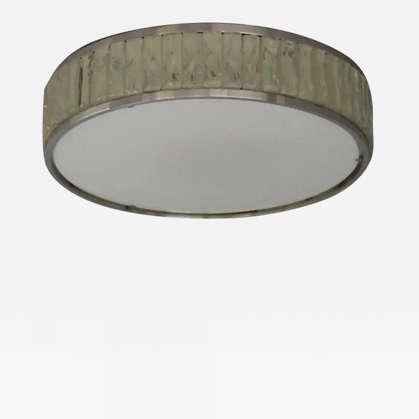Jean Perzel – A Fine French 1970s round « Queens Necklace » flush mount/ceiling light made with rough laid glass slabs set between two nickel frames and a white opaline glass diffuser (which is removable for bulb replacement).