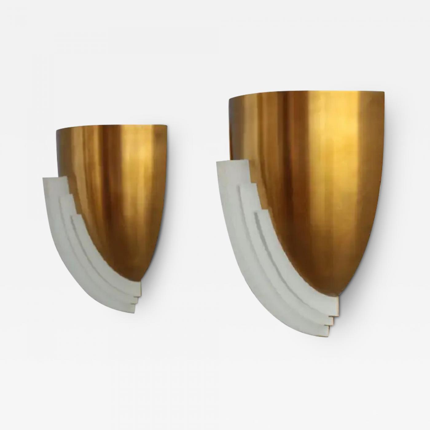Jean Perzel – A pair of fine French Art Deco wall lights made with a semi-oval bronze bowl adorned with hand-cut crystal glass slabs. Signed.