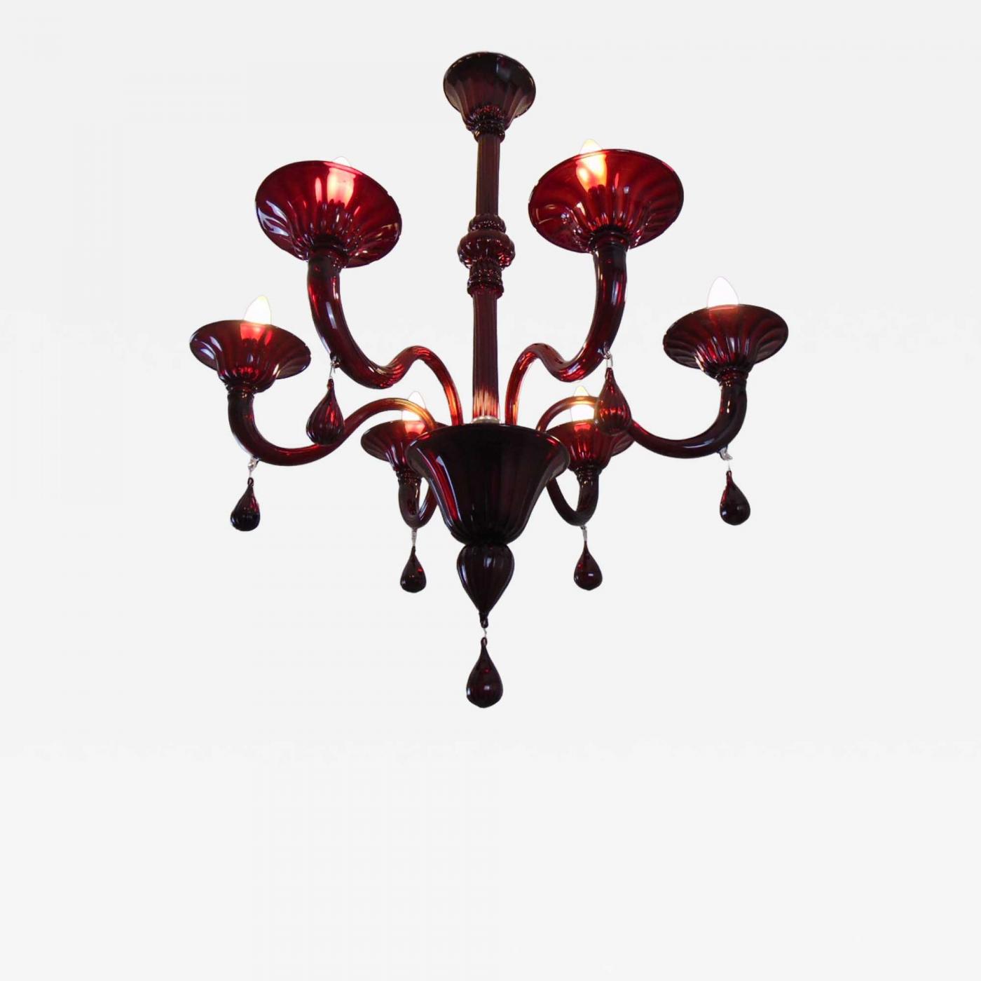 Gocce venetian red chandelier with red glasses and polished chrome metal finish.