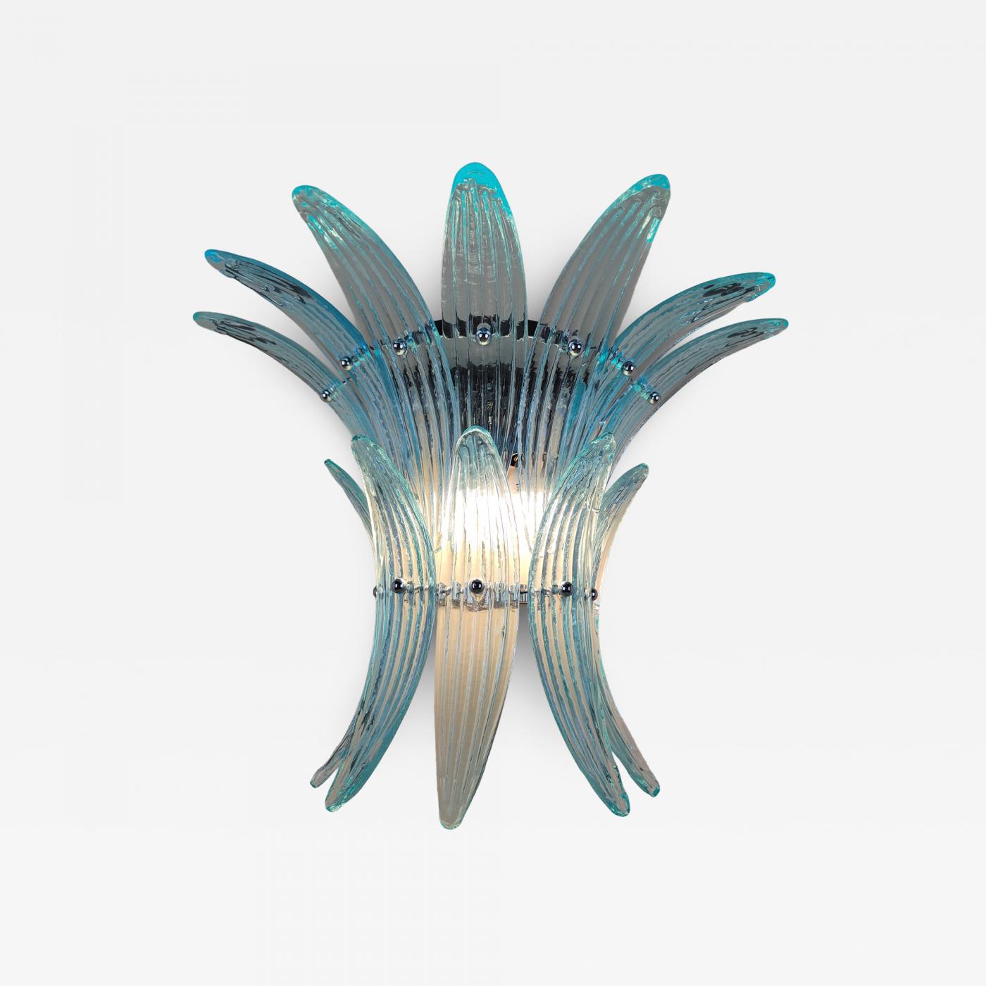 Palmette Murano glass wall sconce with turquoise blue glasses and polished chrome metal finish.