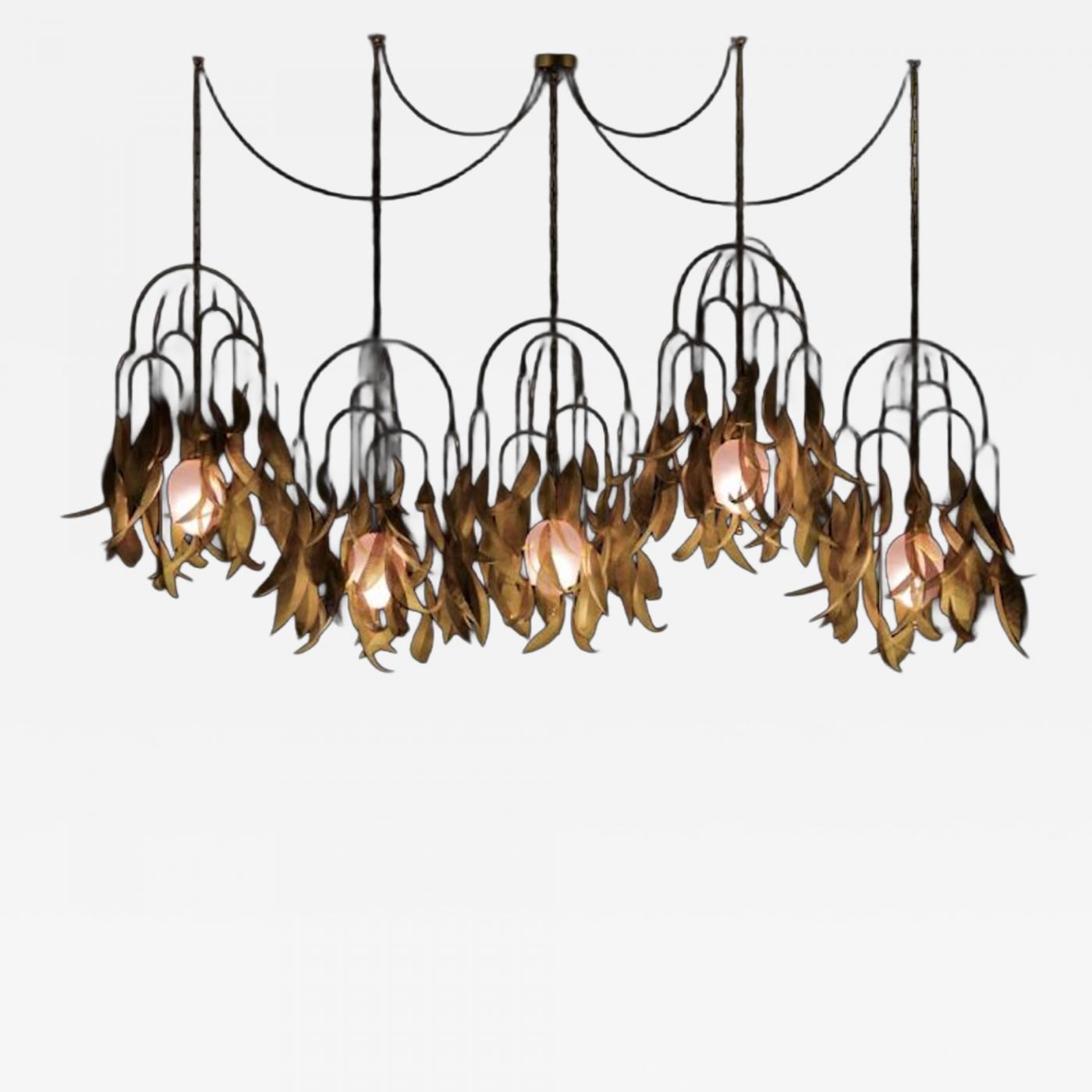 Introducing Saule, a striking lighting fixture inspired by the graceful beauty of the willow tree. Each piece is meticulously handcrafted in our Verchères studio by our talented team, ensuring every detail captures the essence of nature. With cascading, hand-formed brass leaves hanging from elegant metal arches, Saule reflects light like the shimmer of willow foliage gently swaying in the breeze. At the heart of the fixture rests a slightly pink glass globe, like a delicate fruit suspended within the tree's branches, emits a soft, warm glow that enhances the organic beauty of the design. The entire structure, reminiscent of a mobile, moves ever so slightly with the air, creating an ethereal, living quality that draws attention and adds a serene ambiance to any space. Available in configurations with one, three, or five individual Saule fixtures, this design offers versatile options to suit various interior needs, from a single statement piece to a breathtaking multi-fixture installation. Saule is not just a light—it's a handcrafted piece of art, designed to bring the elegance and tranquility of the natural world into your home.