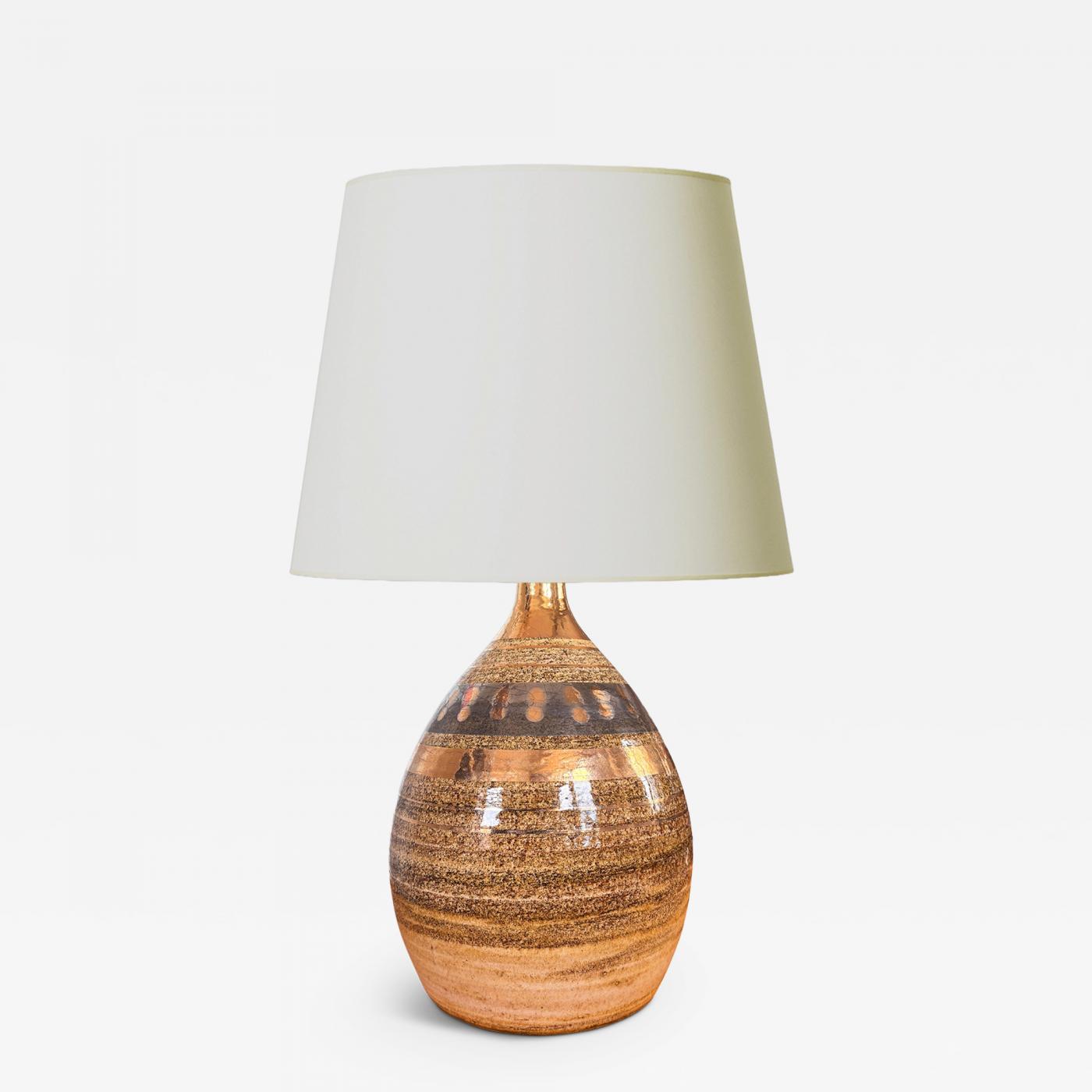 Striking table lamp by Accolay potter Georges Pelletier (b. 1938), having an organic fig-like peaked ovoid form, glazed with textured sandy tones and gilded stripes; earthenware; France, 1970s; inscribed “Pelletier” near base