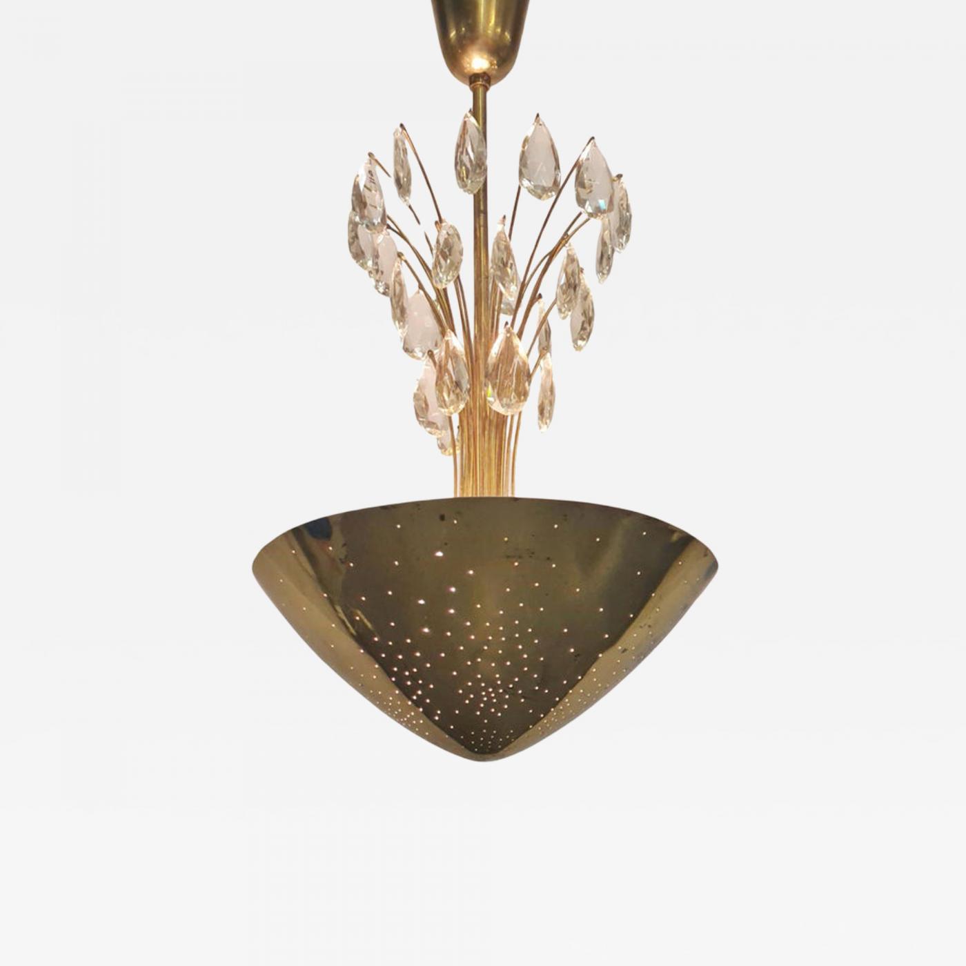 A beautiful ceiling lamp by Lisa Johansson-Papé brilliantly combining a classical touch with the modernistic perforated brass design. The crystals hang like rain drops and are beautifully illuminated by the up-light from inside the perforated brass shade. The lamp is imprinted with the manufacturer's stamp Orno and is in its original patina with some dark spots on the brass shades. All in all, the lamp looks really nice.