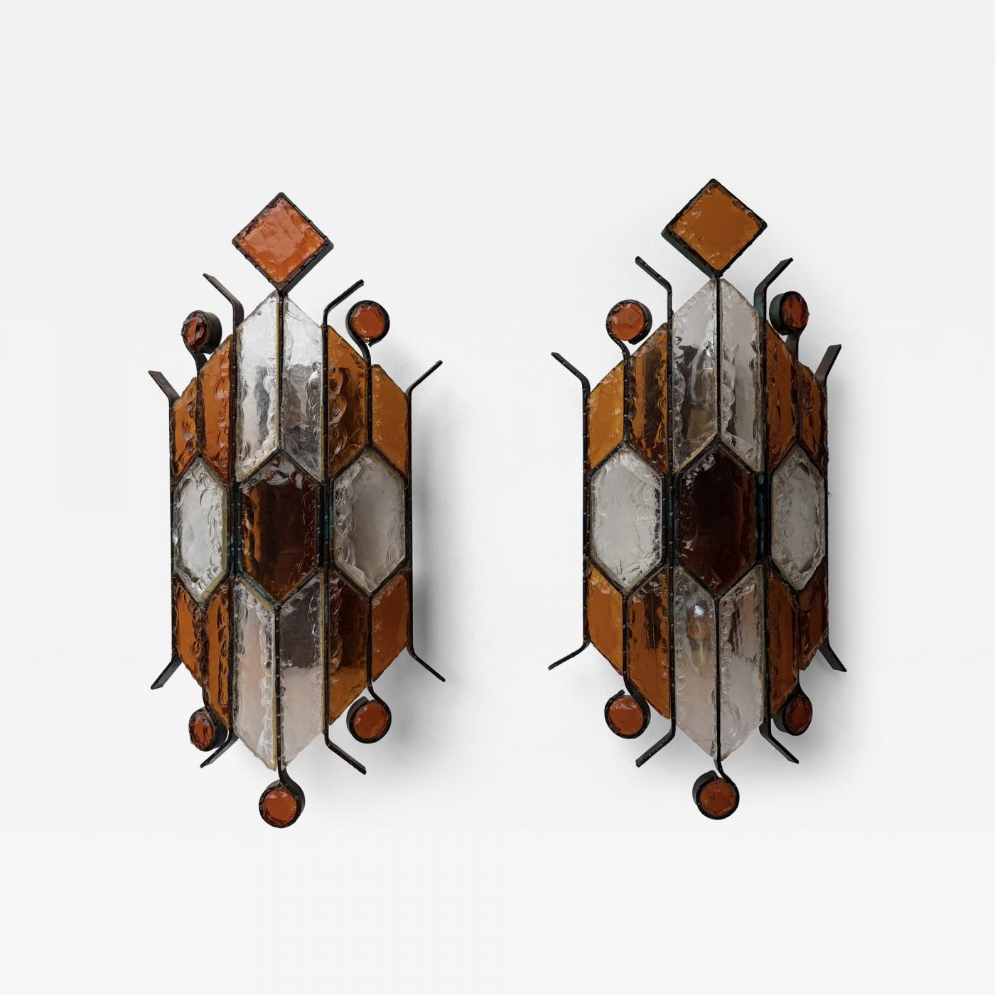 Pair of Mid-Century Modern wall lamp light sconces model Pagode in amber and clear hammered glass and wrought iron, gilding gold copper patina, by the manufacture Longobard in Verona in a Brutalist style, the concurrent of Biancardi Jordan Arte and Poliarte during the 1970s. Famous design like Carlo Aldo Nason for Mazzega Murano, Venini, Vistosi, La Murrina, Esperia, Angelo Brotto.