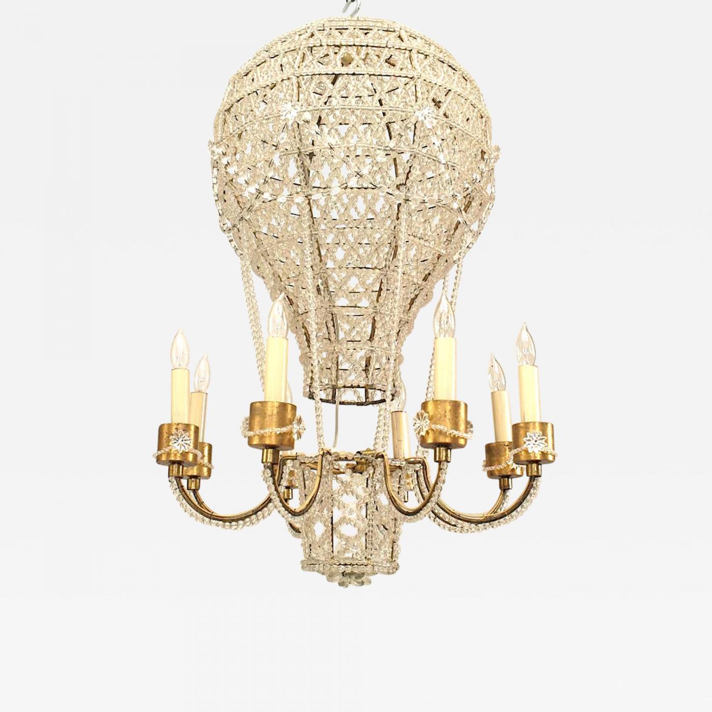 French 1930s hot air balloon shaped chandelier with basket supporting 8 gilt metal arms with beaded crystal trim (att: BAGUES; restored)
