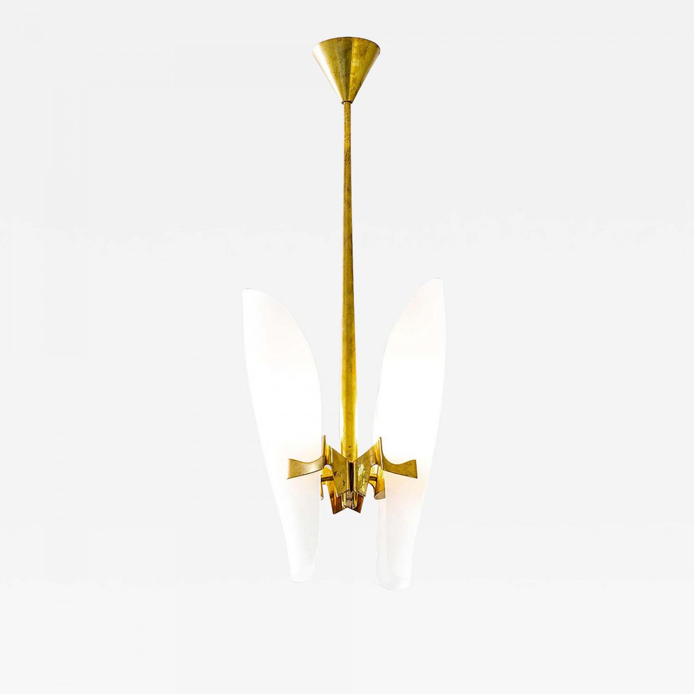 Here we have a very peculiar chandelier in nickel-plated brass frame and two satin-finished curved crystal diffusers designed by Max Ingrand for Fontana Arte in 1960s.
