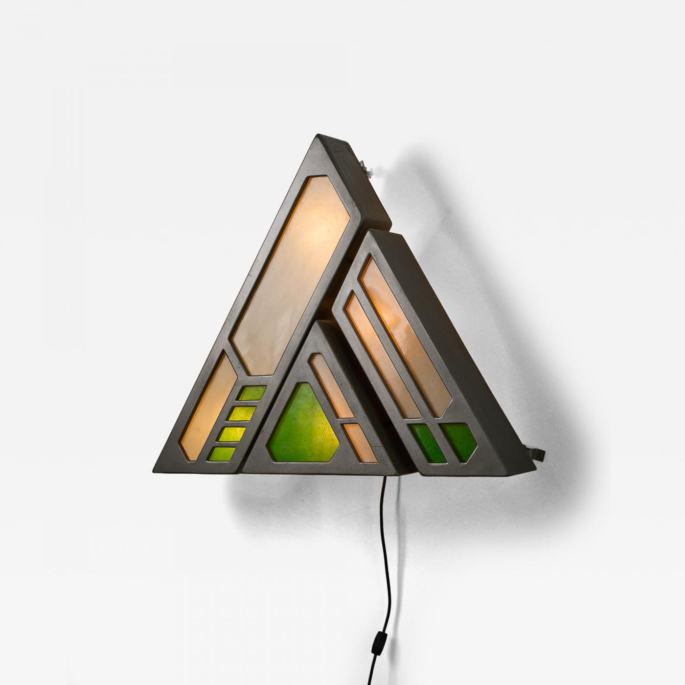 This large-scale illuminated wall sculpture by Michel Tess features a complex arrangement of nested triangular and rectangular forms. The industrial metal framework is offset by vibrant green translucent panels that project a graphic, architectural glow when the internal lamps are engaged. The piece is structured to be wall-mounted, providing both a sculptural presence and ambient light.