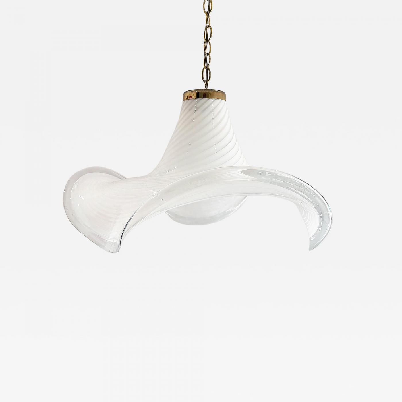 Offered for sale is a sinuously curved Mid-century hand-blown swirled Murano pendant chandelier in translucent and white Murano glass. The rim floats up and down the circumference of the fixture. The pendant accommodates a standard single bulb. We suggest using a cooler tone bulb to have a white light, rather than the warm tone incandescent bulb shown in the photo. The cap at the top of the fixture is brass. The chain length 18.25 and can be added to or shortened as needed.