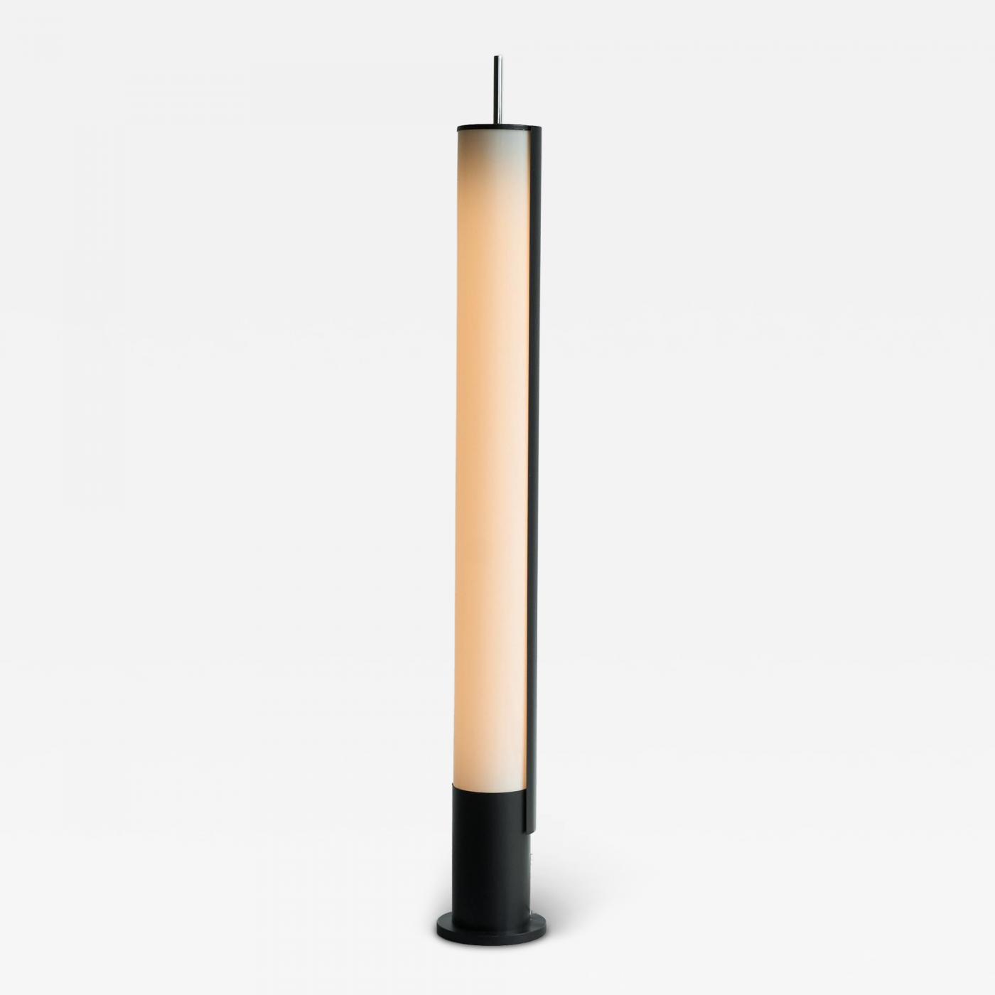 It is a very clear and modernist design with a cylindrical shape made out of metal and white perspex - with a chromed finial on top. Timeless and very avant garde for its time - this certainly wasn't just any lamp. Great proportions and details, like the brown / red inside of the metal to give the light a pleasant color.
