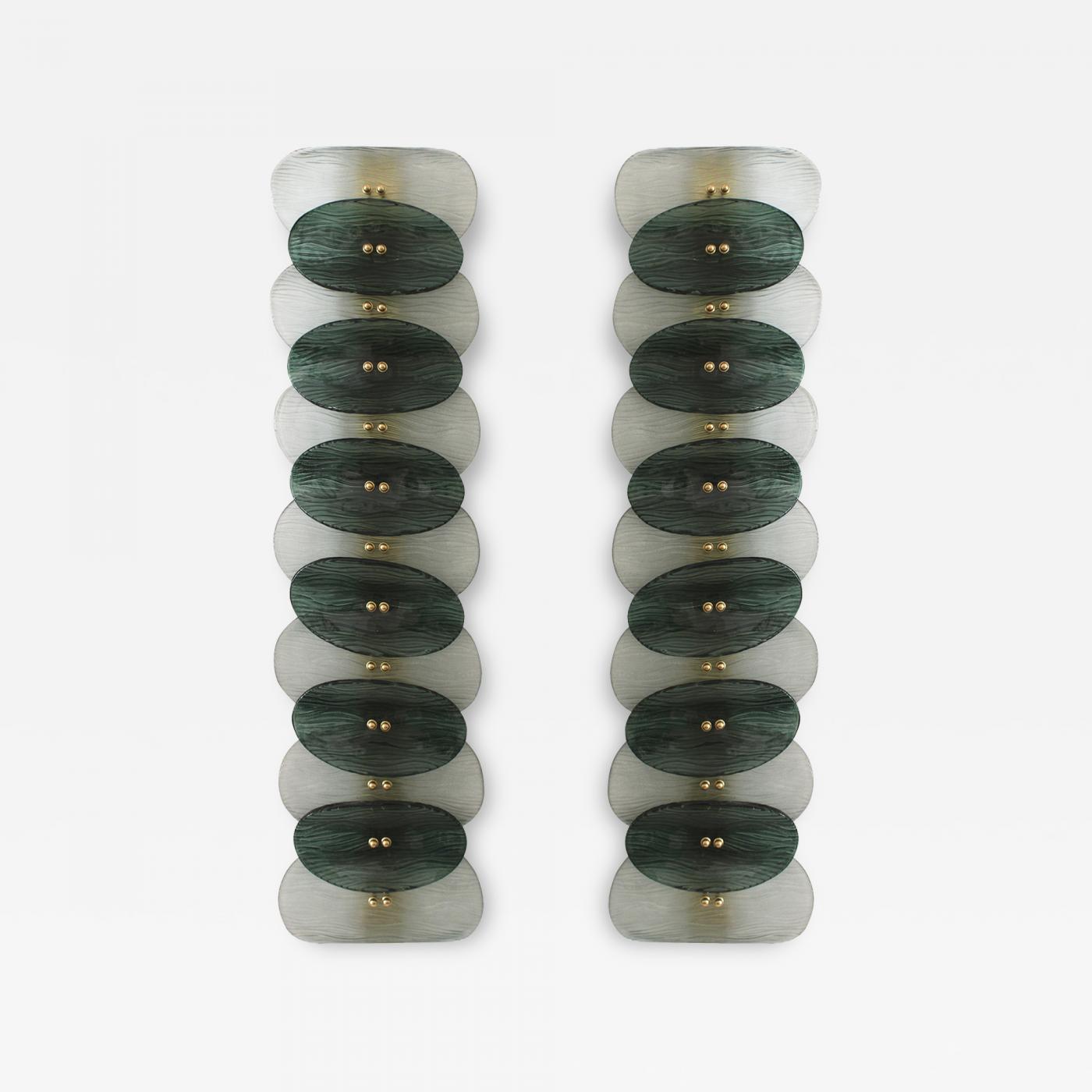 Sculptural pair of Murano glass and brass wall sconces, composed of vertically stacked oval elements creating a refined rhythmic composition. Each sconce features alternating translucent frosted Murano glass and deep green textured Murano glass panels, delicately secured with refined brass fittings.