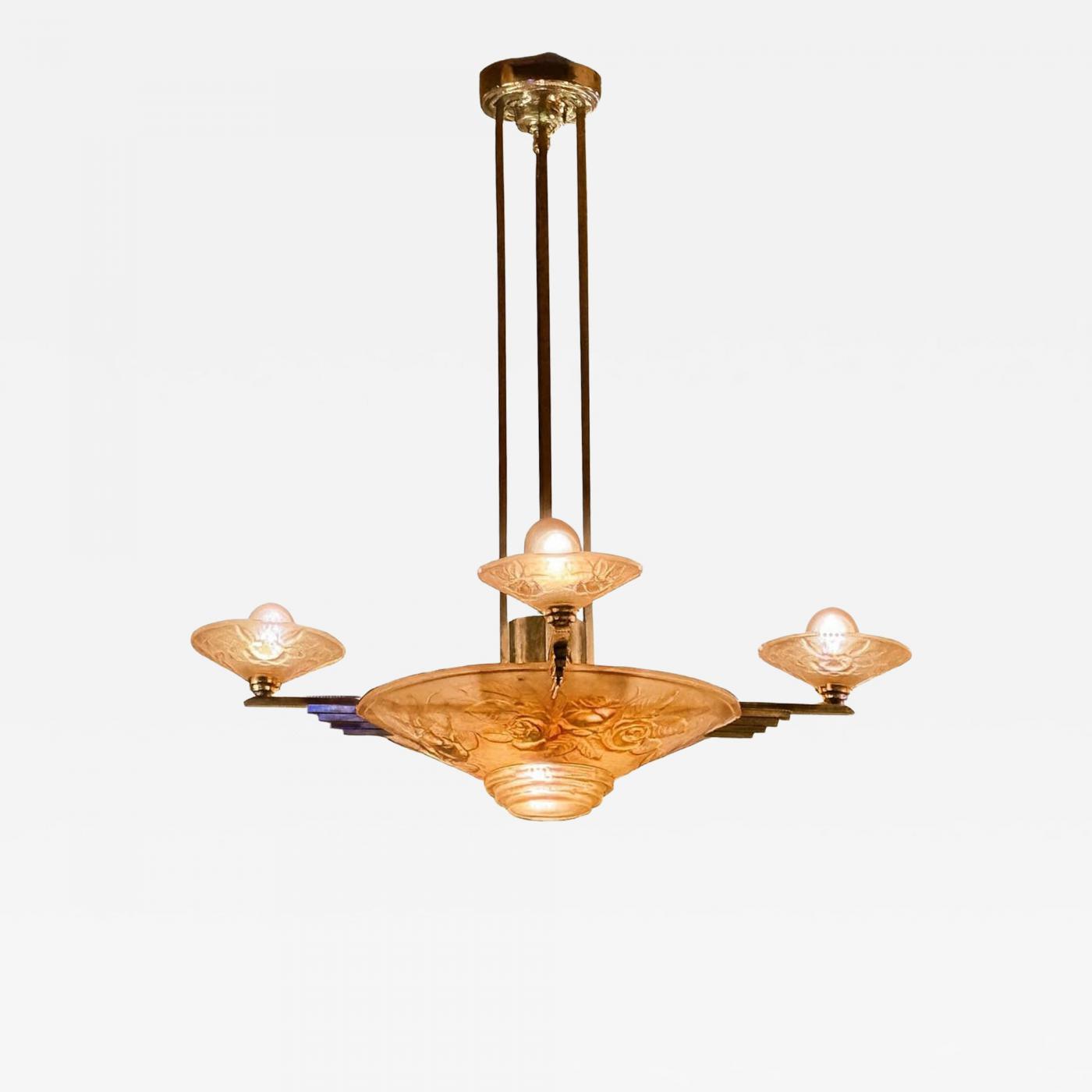 Muller Frères chandeliers in peach-pink glass are highly sought after and seldom appear on the market. This piece not only represents the exceptional artistry of Luneville glassmaking but also embodies the period’s embrace of both luxury and modern design. Its condition, signature, and rare coloration make it a standout addition for serious collectors of Art Deco lighting. - More Information