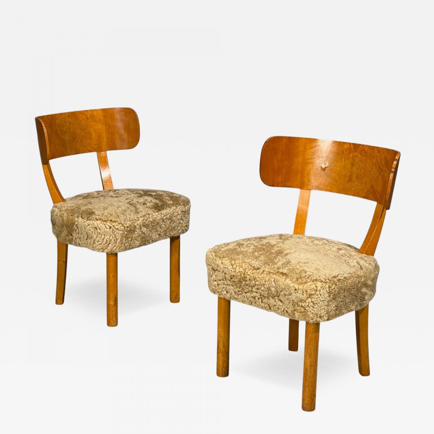 A rare pair of “Birka” dining or side chairs designed by Axel Einar Hjorth (Sweden, 1888–1959) for Nordiska Kompaniet in the 1930s. Axel Einar Hjorth served as the lead designer for Sweden’s Nordiska Kompaniet department store from 1926 to 1938. Each example features clean lines and curved backrests typical of Hjorth’s restrained modernist approach. The drop seats have been newly reupholstered in a gorgeous curly genuine shearling. A significant example of Hjorth’s refined yet utilitarian aesthetic, produced during his influential tenure as chief designer at Nordiska Kompaniet. Our gallery has the matching "Birka" model sideboard (with its original NK label) available as well as a set of 6 "Birka" chairs; please inquire for more information regarding this case piece or complete dining chair set. Repairable veneer damage present on the curved backrests of each example. Wood presents with scratches and patina throughout.