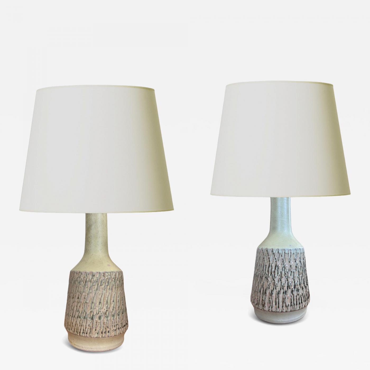 Brutalist style pair of table lamps by Ole Christensen (1932-2000), having flared drum forms with rustically textured sides and tall necks, glazed in a matte pale khaki tone; earthenware; Denmark, 1960s-1970s; foil maker decals