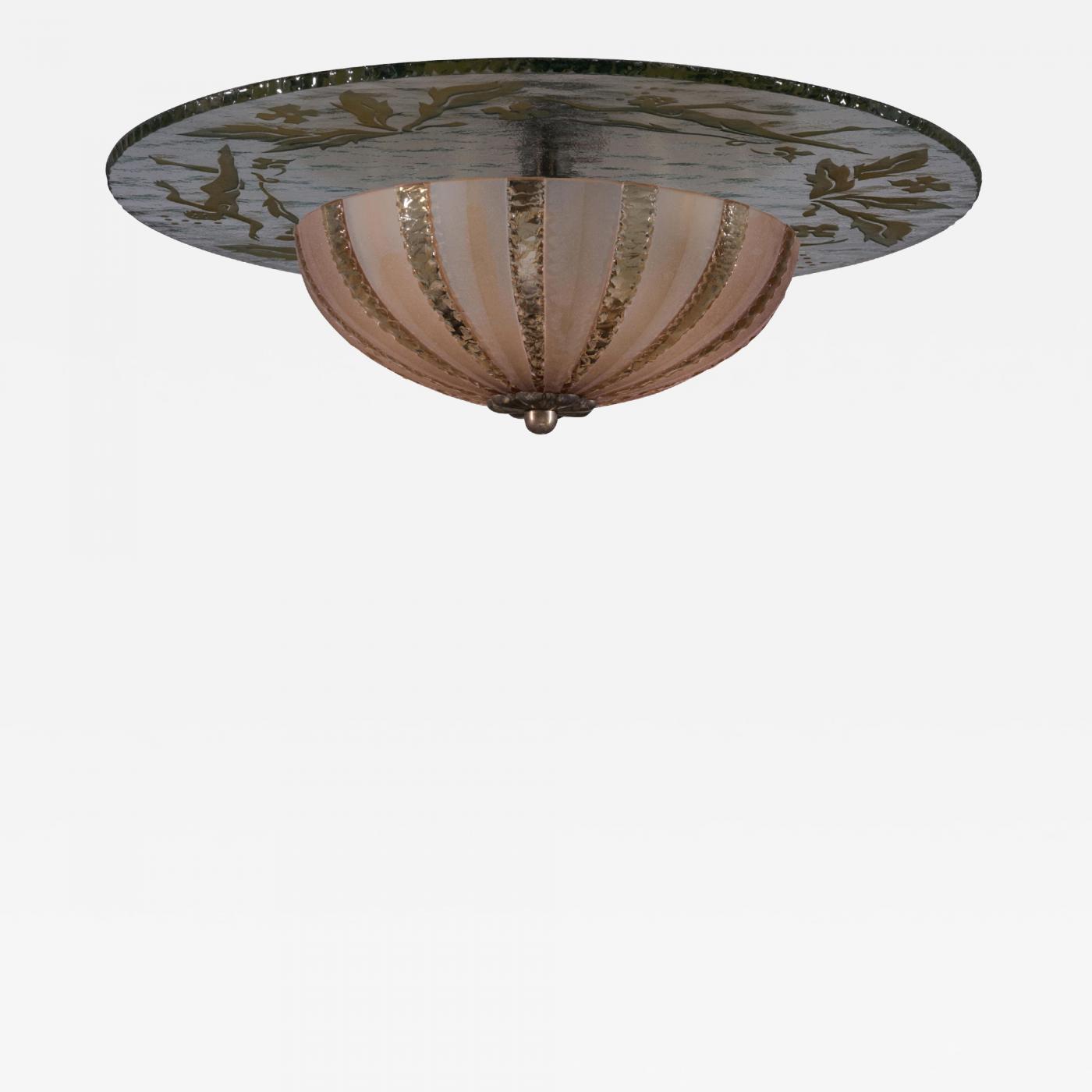 An Art Deco ceiling lamp attributed to Orrefors, Sweden. It has an etched, Havana colored glass shade with a decorated, raw glass disc above it.