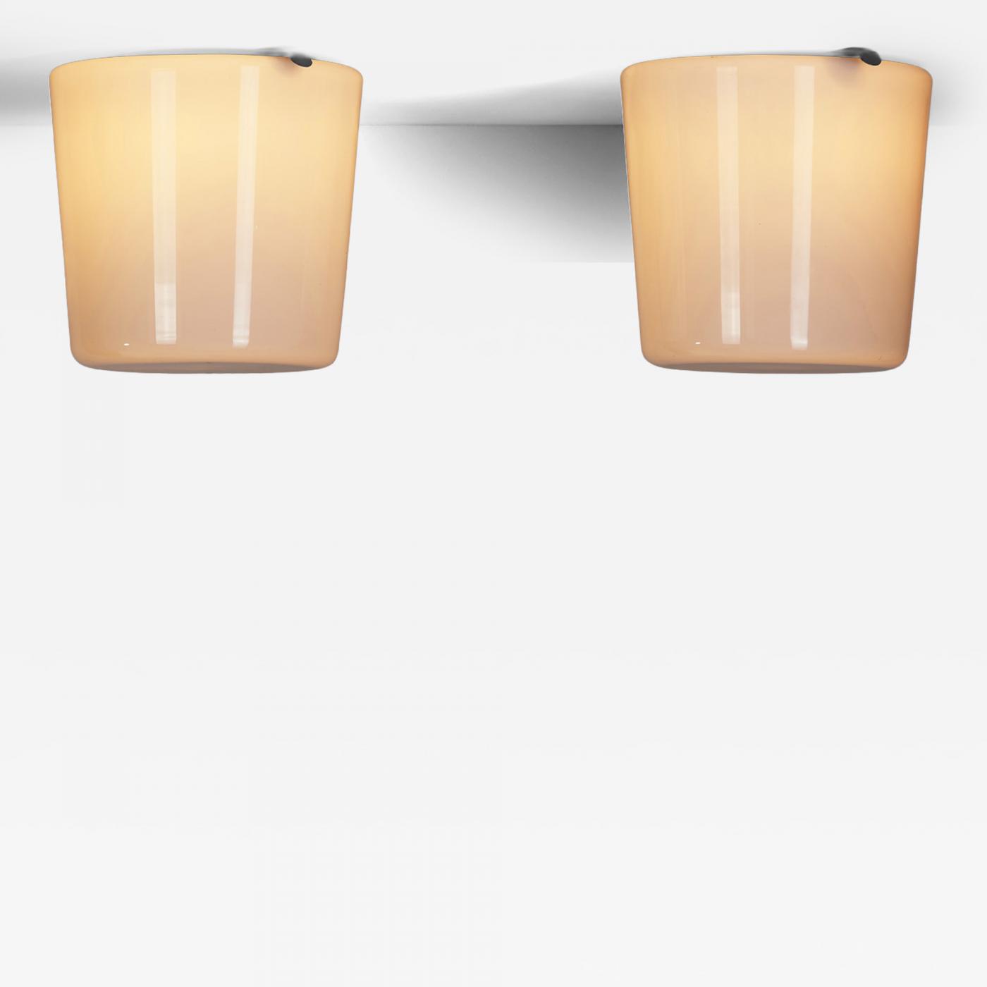 Tynell’s designs in the ceiling lamp series that these lamps belong to merge together simple shapes and sculptural elements. In the 1930s through the 1950s, he designed a number of iconic lamps that are still sought after today, including this pair of milk glass ceiling lamps with the model number “2040”. These lamps embody the sleek and simple aesthetic that characterised Finnish lighting design of the mid-century period. Still, even in the absence of ornamentation, there was always an emphasis on interesting materials. Milk glass, appropriately named for its opaque or transparent pure ivory white tone, was first created in Venice in the 16th century, known as Lattimo. At that time, it was widely used for decorative purposes and continued to be popular during the 20th century, when the material was used for decorative home accents. These lamps have an eye-catching bucket shape that has a strong presence sticking out - quite literally. Still, the edges are just as soft as the light these lamps emit. Thanks to the concealed aluminium ceiling holder, these lamps are flush mounted without any exposed parts but the glass shades. Tynell was a master of working with milk glass, and his lamps of this material are some of his most sought-after designs.