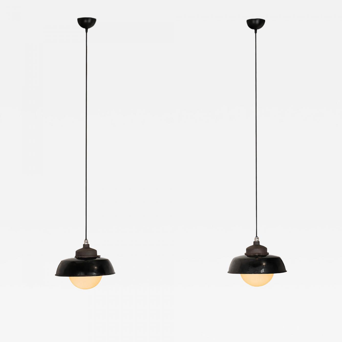 Finnish modern design places at its core the inventive use of lighting and the incorporation of natural elements. There is an emphasis on clean lines, geometric shapes, and a focus on practicality. With this pair of hanging lamps lies a focus on both simplicity and functionality. Clean lines and harmonious proportions highlight the quality of this pair’s construction, while the understated design allows it to blend seamlessly into different settings. This model dates to the designer’s pre-brass era and is executed in an early modern functionalist style. These lamps have a gentle, round shape that is just as soft as the light they diffuse. Even in the absence of ornamentation or elaborate shapes and forms, there is still an emphasis on interesting materials. The canopy and stem are enamelled, while the inner shades are made of opal glass. Opal glass was a popular material for lighting fixtures of this era, due in part to its ability to diffuse light. As these lights demonstrate, it was also prized for its lustrous, opaque finish, which gives the design a sophisticated and refined look. Tynell was a master of working with this material, and his opal glass lamps are some of his most sought-after designs even today. The juxtaposition of the white glass and black metal is a classic example of the contrast and harmony that early-to-mid 20th century design often seeks to achieve.