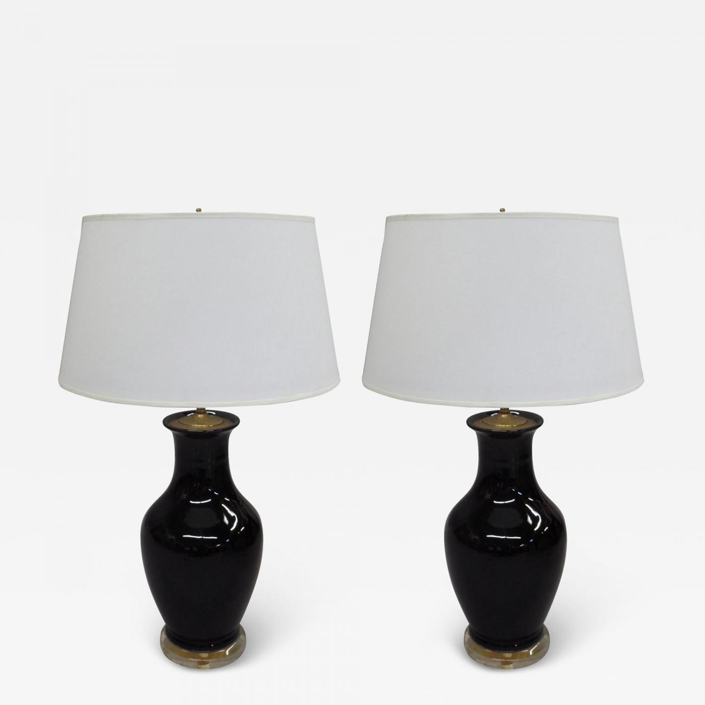 Pair of French Mid-Century Modern Black Opaline Glass and Lucite Table Lamps