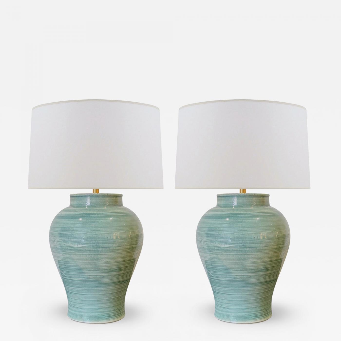 Pair of green strie stoneware urn shaped table lamps