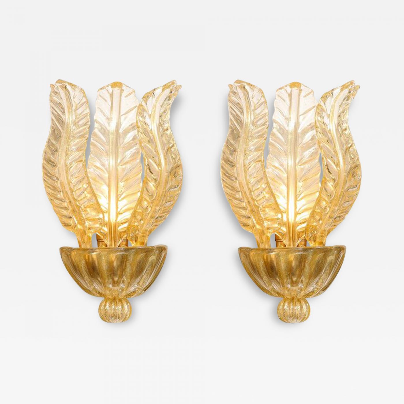 Pair of Hand-Blown Modernist Murano Foglia D'oro Glass Leaf Form Sconces