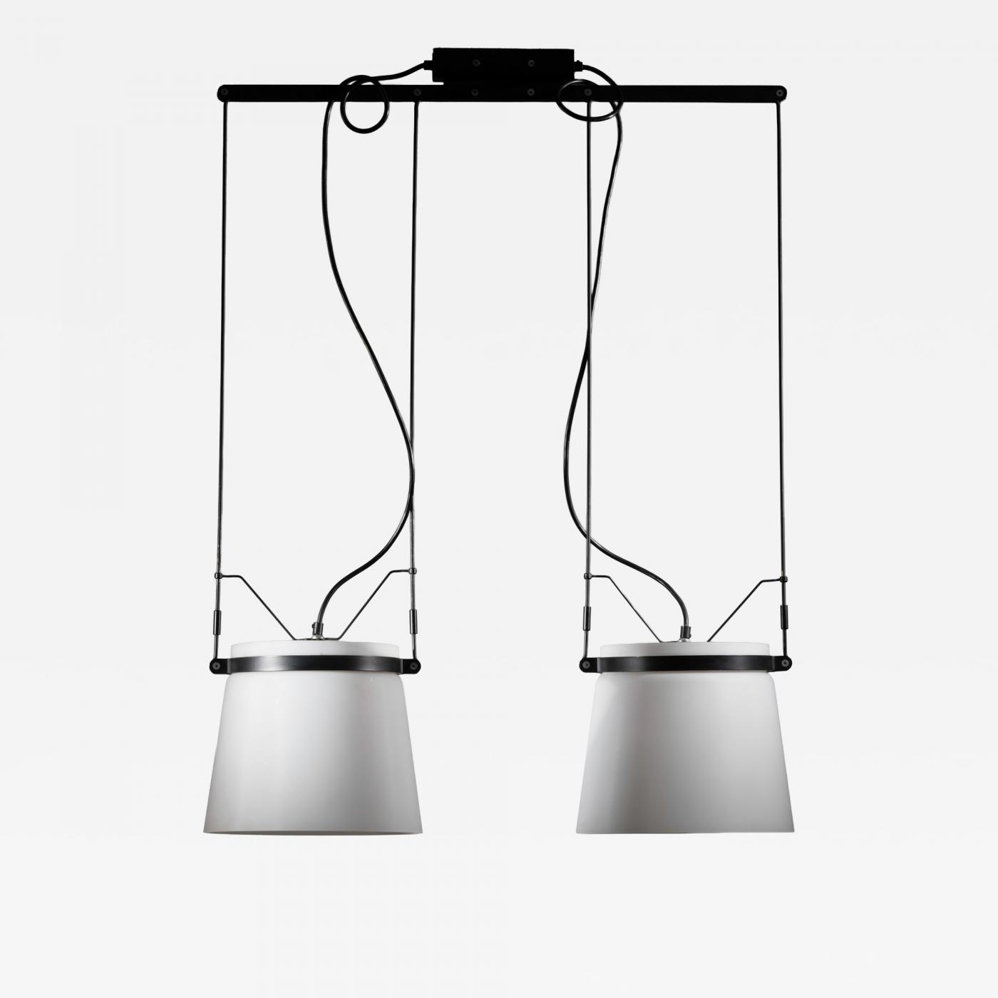 A double shaded pendant by Paolo Rizzatto, co-founder of Luceplan, featuring two opaline glass shades with a black metal suspension.