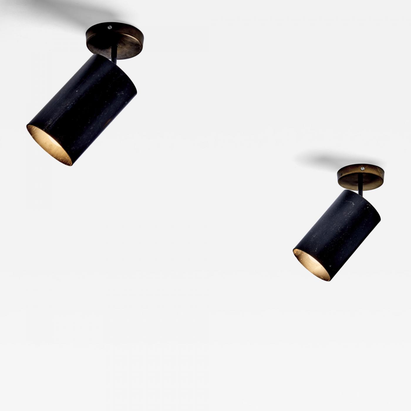 Versatile pair of cylindrical lamps by Parscot, suitable for ceiling mounting. Crafted from metal with a richly aged patina, each fixture can be angled to direct light. In original condition with authentic wear consistent with age and use.