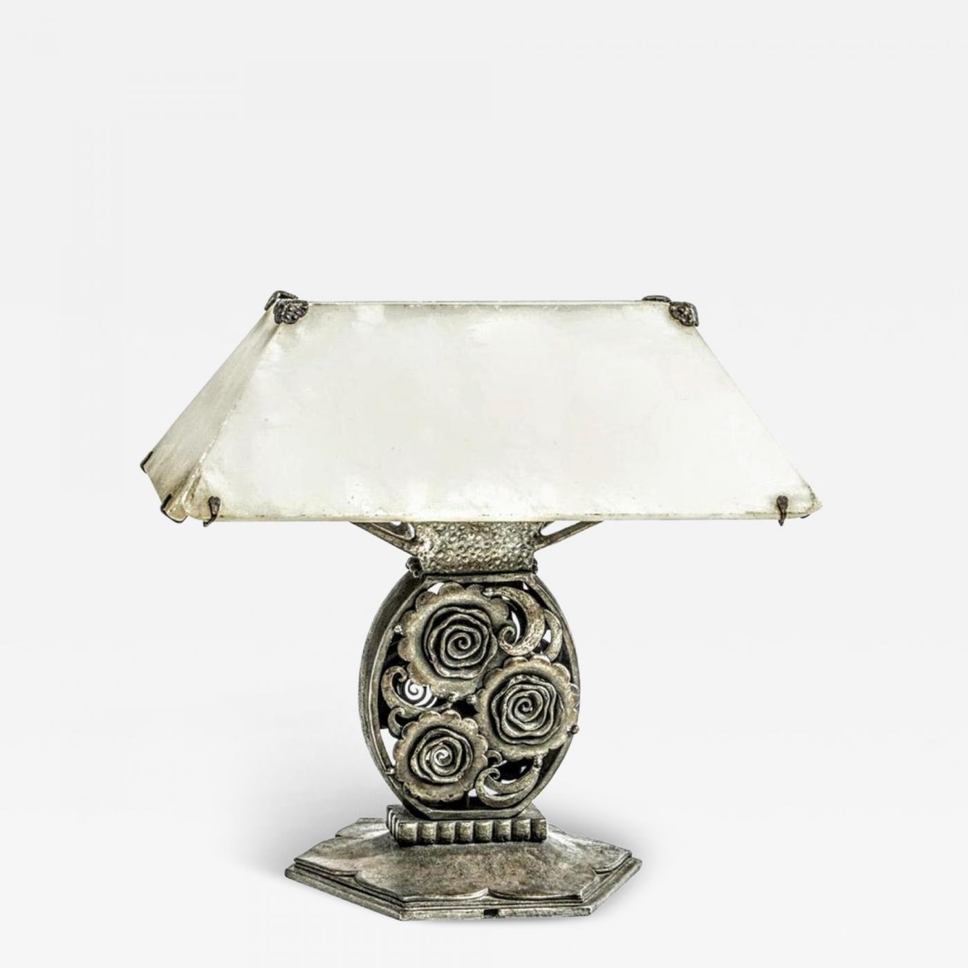 French Art Deco hand forged wrought iron table lamp by the French artist Paul Kiss . Decorated in different textures with fine intricate stylized symmetric geometric scrolled flowers motif and detailed designs throughout with alabaster shade. Rewired to U.S. standards which accommodate two candelabra bulbs (total of 120 watts max) Plating in different finishes upon request with a surcharge.