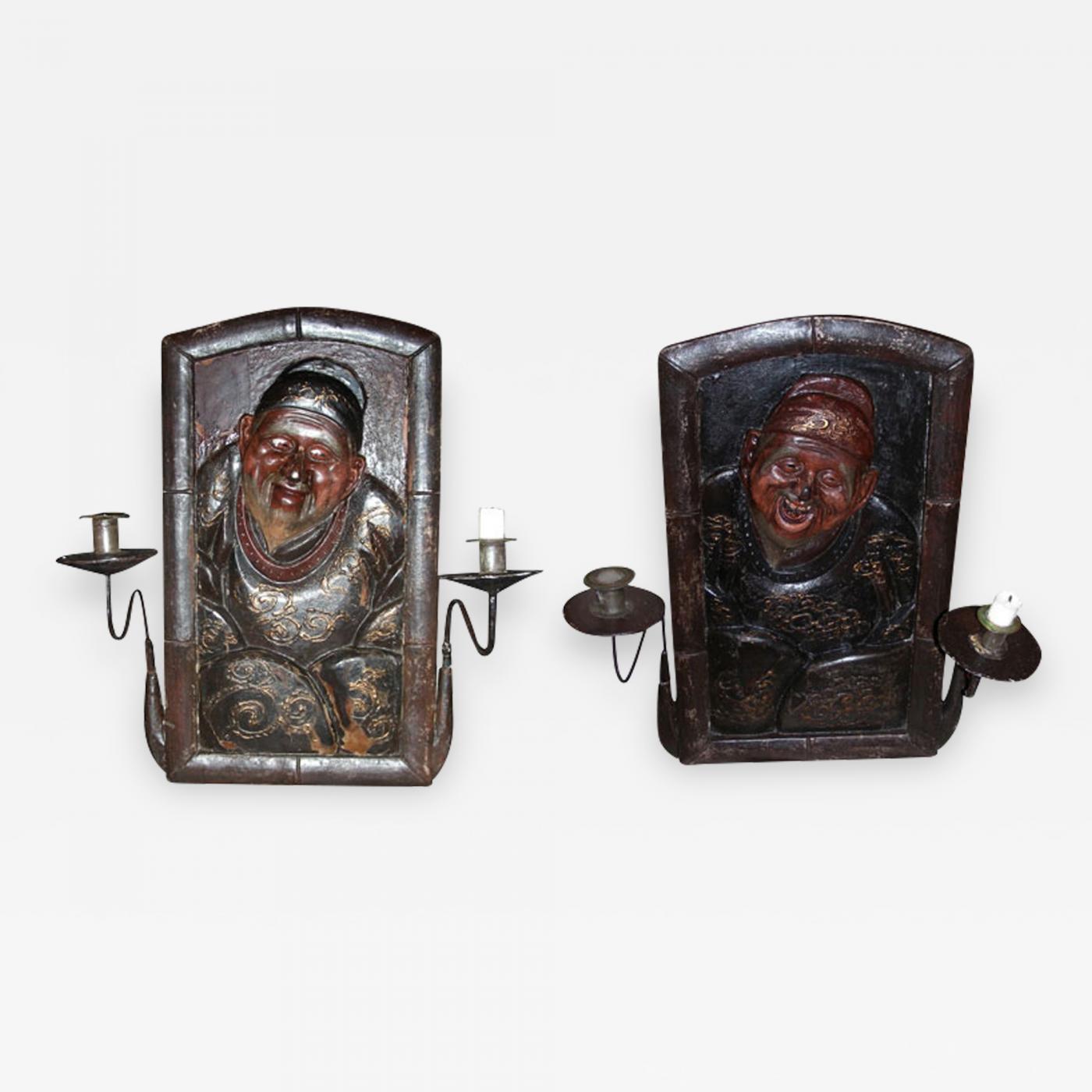Rare pair of end of 19th century sconces, central panel decorated with a Chinese old personage with glass eyes, supporting two arms for lights . Panel is in sculpted wood and papier mâché painted and patinated.