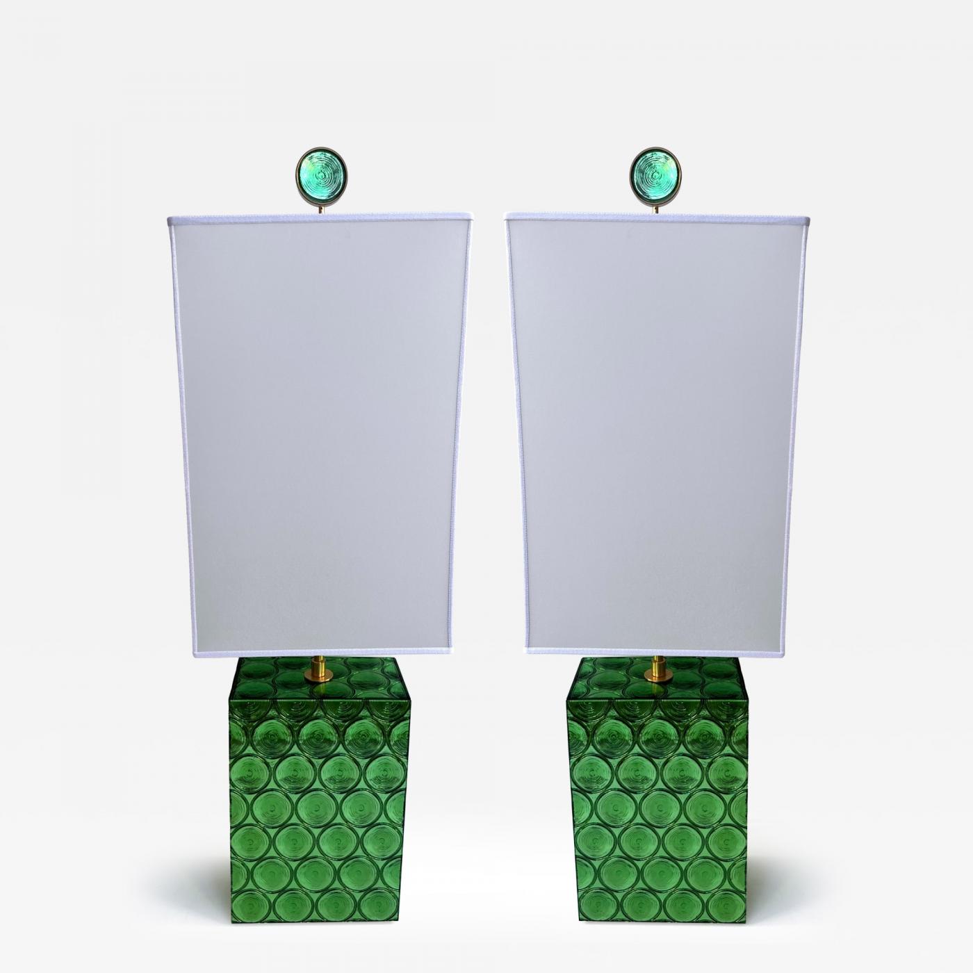 Pair of table or bedside lamps in brass and green optical Murano glass. Contemporary work from the italian design artist workshop Roberto Giulio Rida. Artist signed stamp on the lamps. In a Mid-Century Modern Space Age Hollywood Regency mood, Carlo Nason, Mazzega, Vistosi, Stilnovo, Fontana Arte, Cristal Art, arteluce, arredoluce, Pierre Cardin, Stilux.