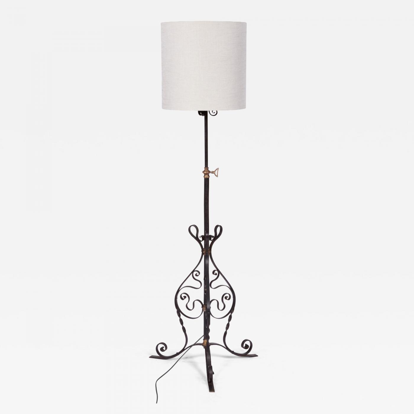 An adjustable height wrought iron floor lamp with graceful scrolled ironwork to shaft and to bold tripod base, with brass collars and decorative brass turn-knob. Ideal for placement beside a reading chair or in a living room. Sold without shade.