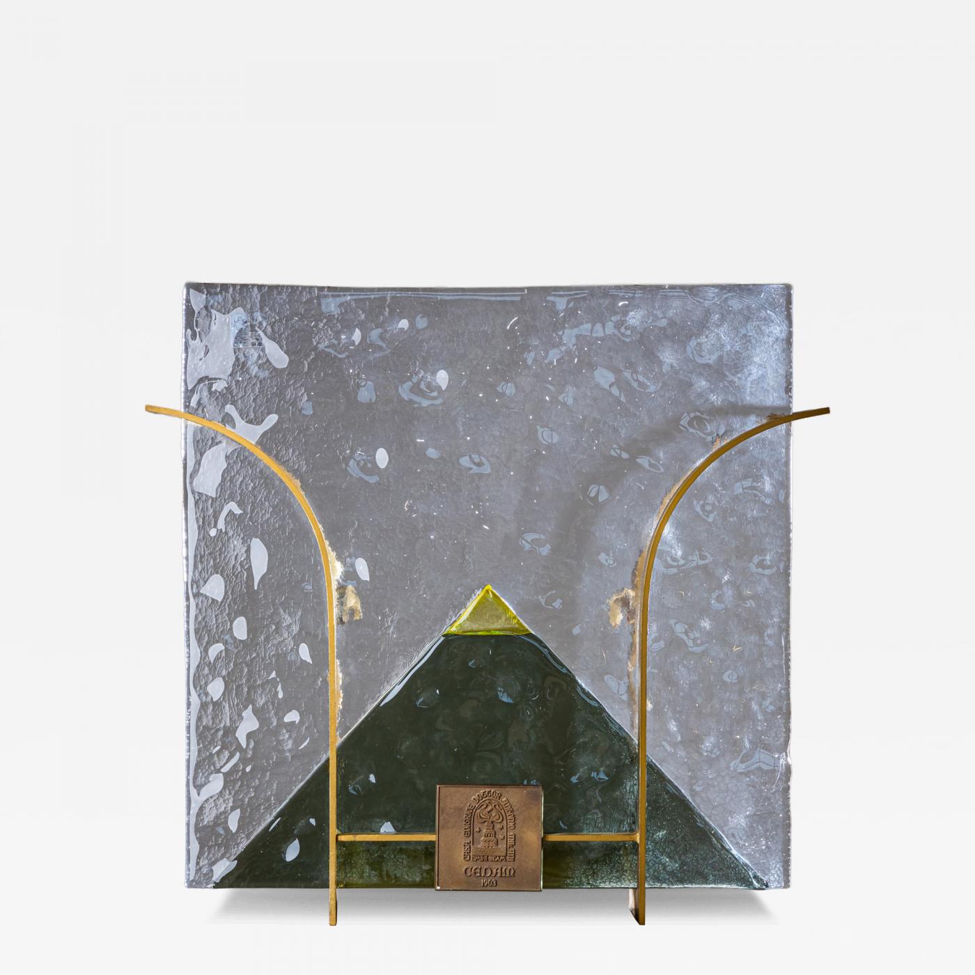 Set of four square wall lights with handcrafted Murano glass shades in clear and deep green glass, featuring a geometric composition with a pyramid-shaped design. The textured, hammered glass surfaces are mounted in sculptural, forked brass brackets. Each piece bears a metal plaque with an engraved mark and retains the original Leucos and Murano label in the upper corner. Likely a custom commission for a special project. Bold and architectural lighting pieces of Italian modernist design.