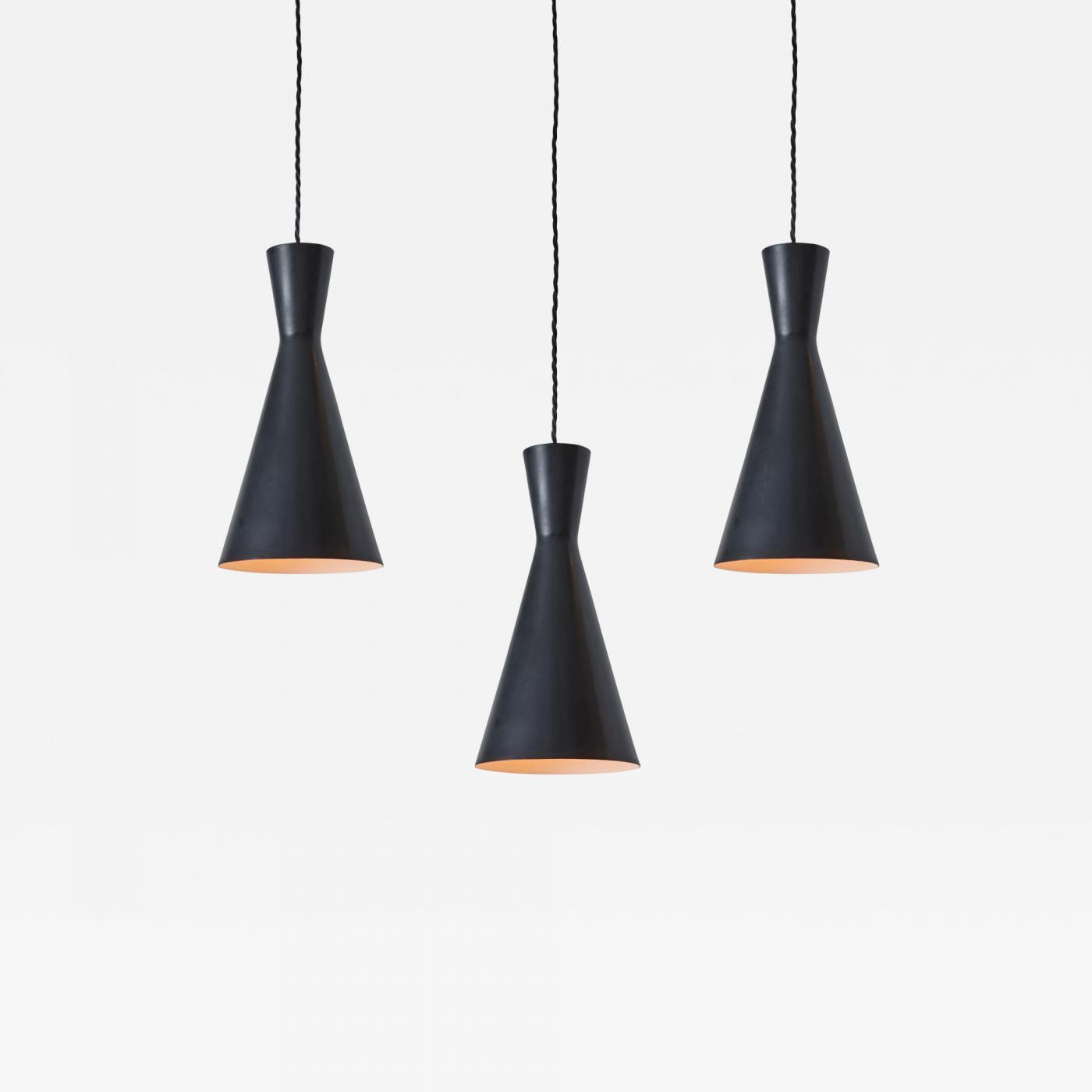 1950s Black metal Diabolo pendant lamp attributed to Stilnovo. Executed in black painted metal with new black cloth cord and custom fabricated period style brass canopy for mounting over a standard American j-box. An incredibly refined and clean pendant characteristic of 1950s Italian design at its highest level.