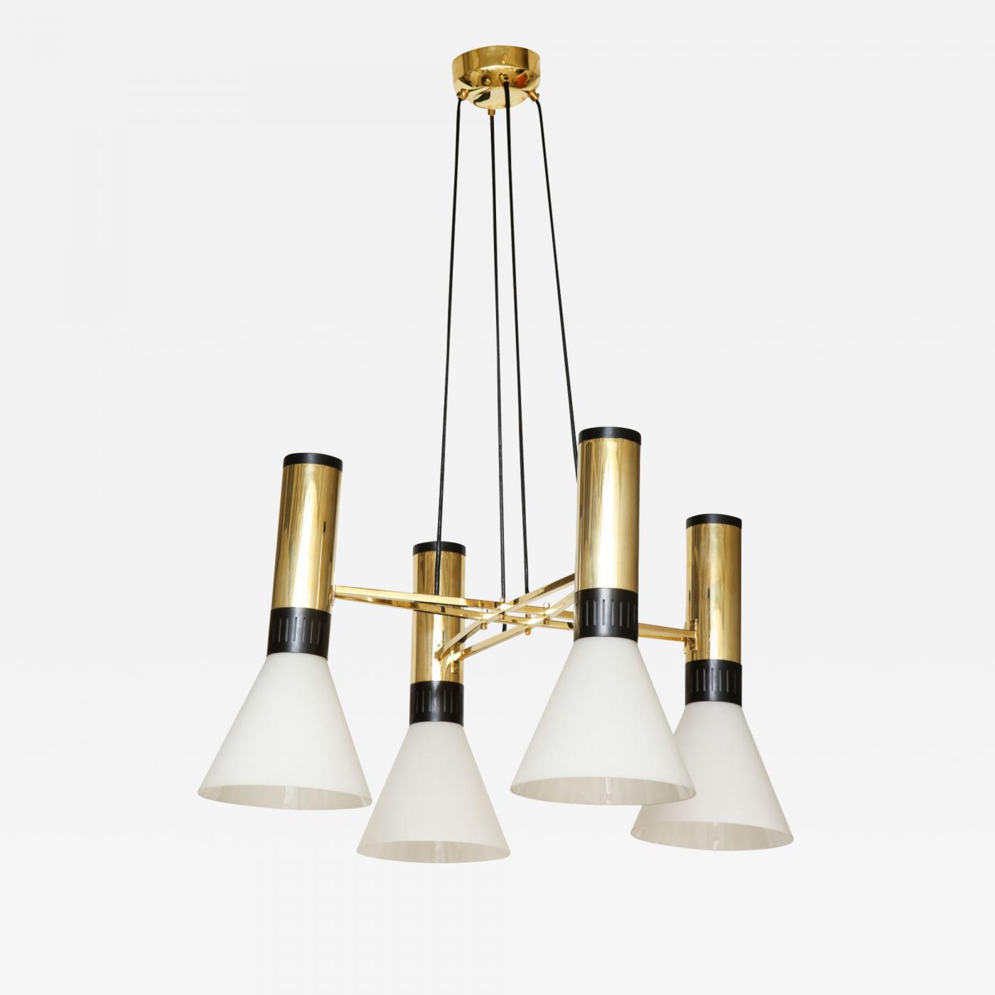 Suspension light in steel and brass with four glass globes by Stilnovo no. 1174, Italy c. 1950