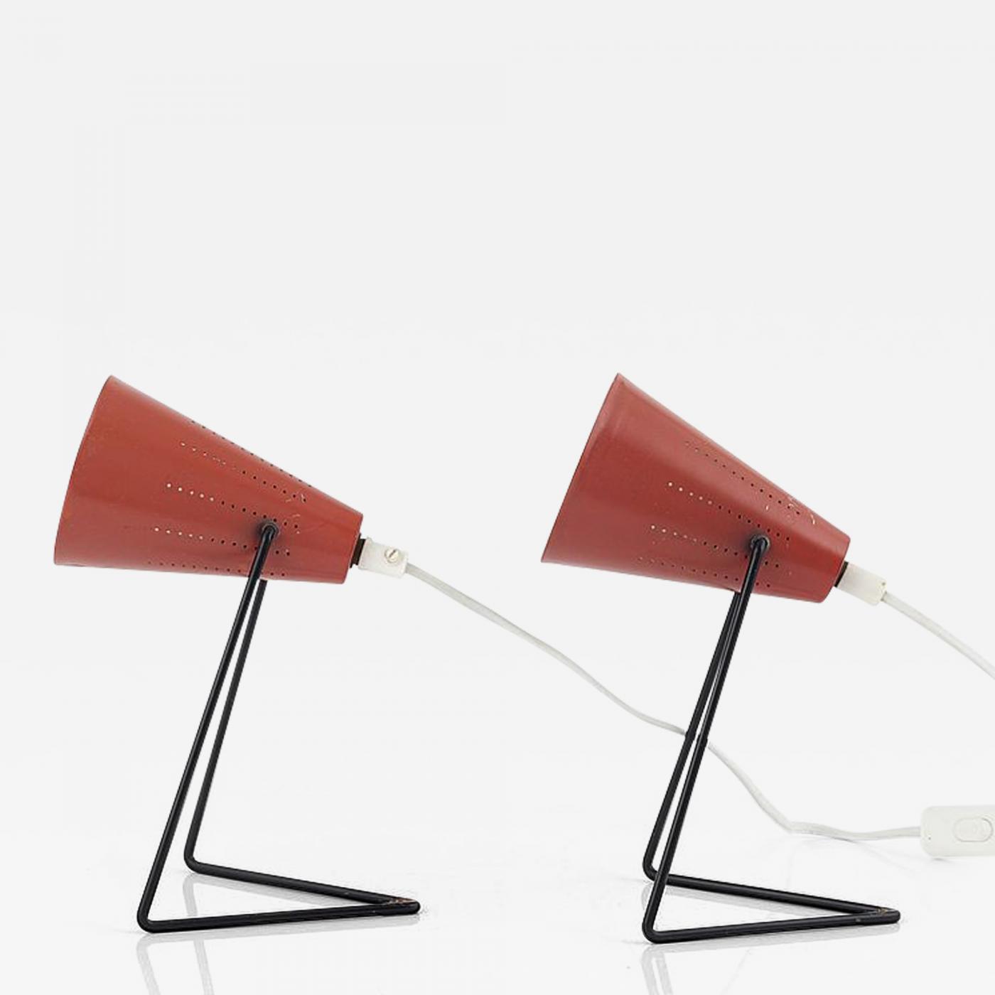 Pair of table lamps designed and produced in Denmark by Svend Aage Holm Sørensen (Denmark, 1913-2004) for ASEA. Each lamp bears it's original manufacturer sticker. The shades are perforated and the red lacquer is patinated.
