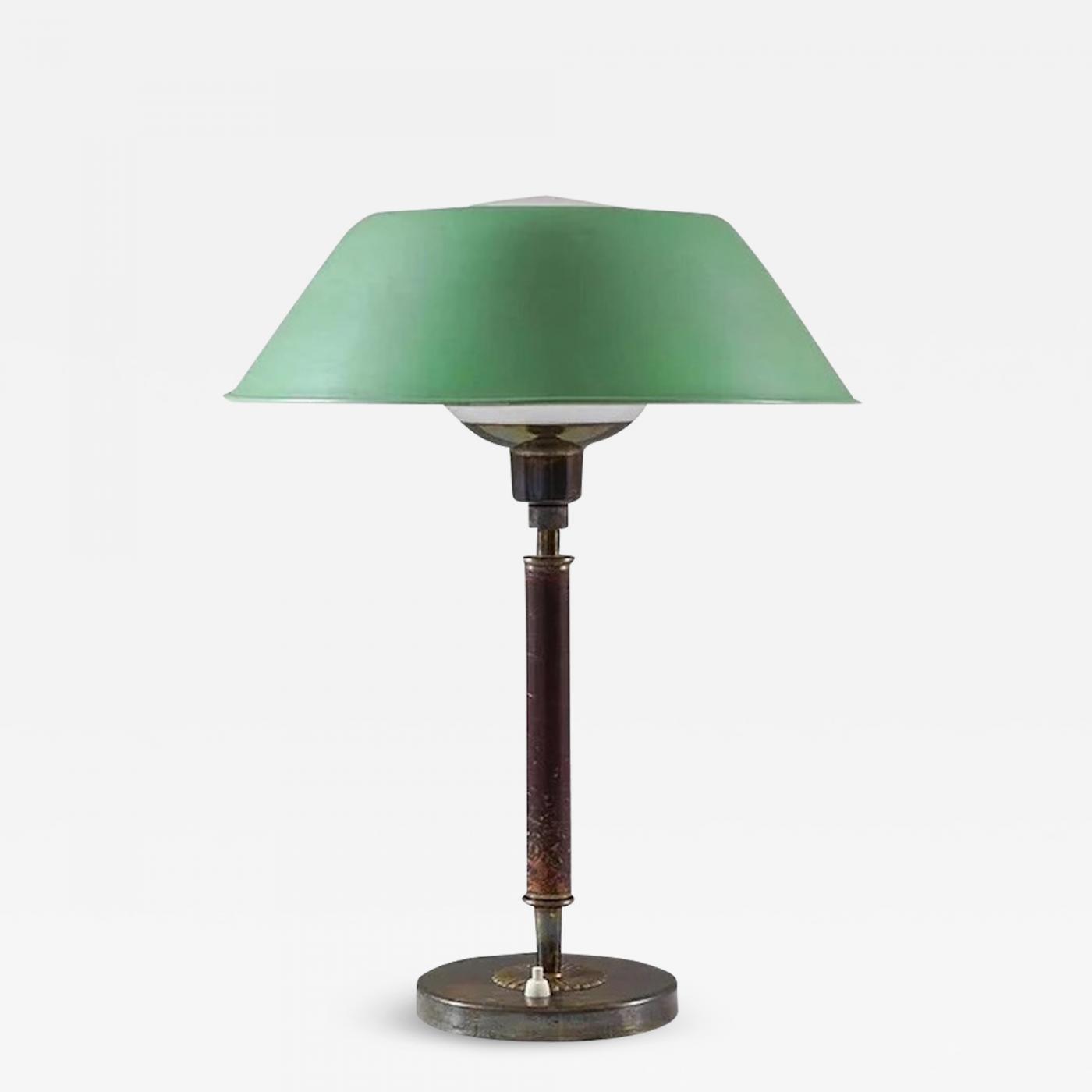 Rare table lamp in brass, leather, glass and metal, most likely manufactured in Sweden, 1930s. This elegant lamp was manufactured during the Swedish Modern era and is of very high quality. It consists of a heavy brass foot, holding a leather webbed base. A glass shade hides the light source (E-27) and supports the green metal shade.