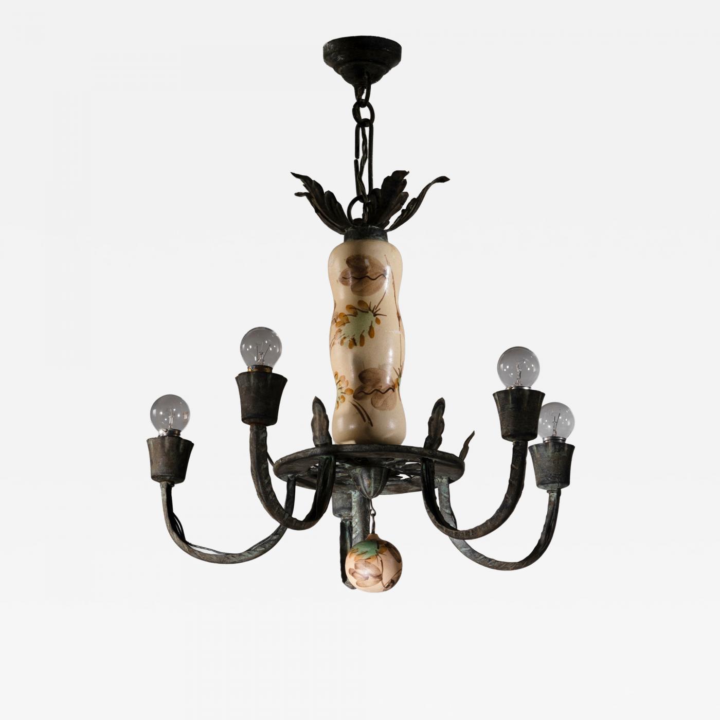 A five-armed chandelier by Antti Hakkarainen for his company Taidetakomo Hakkarainen, featuring a decorated metal frame and a hand painted ceramic central element.